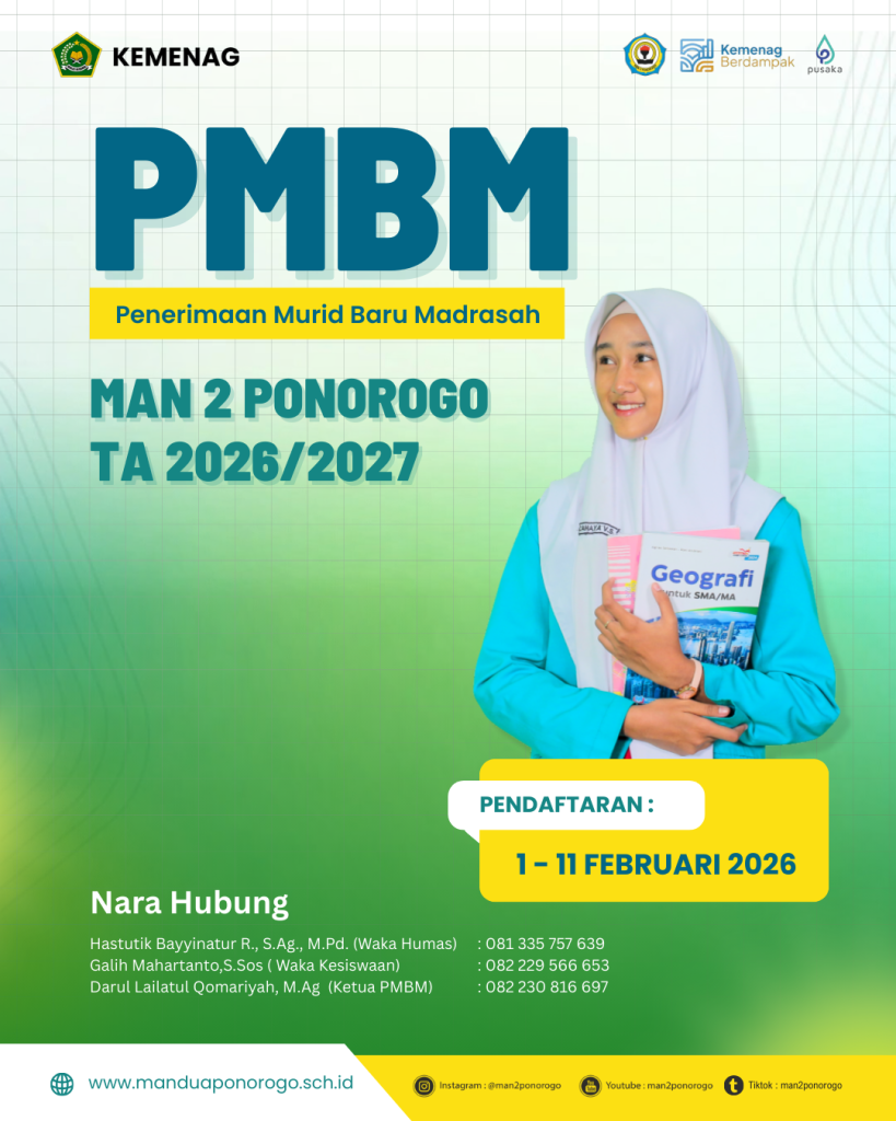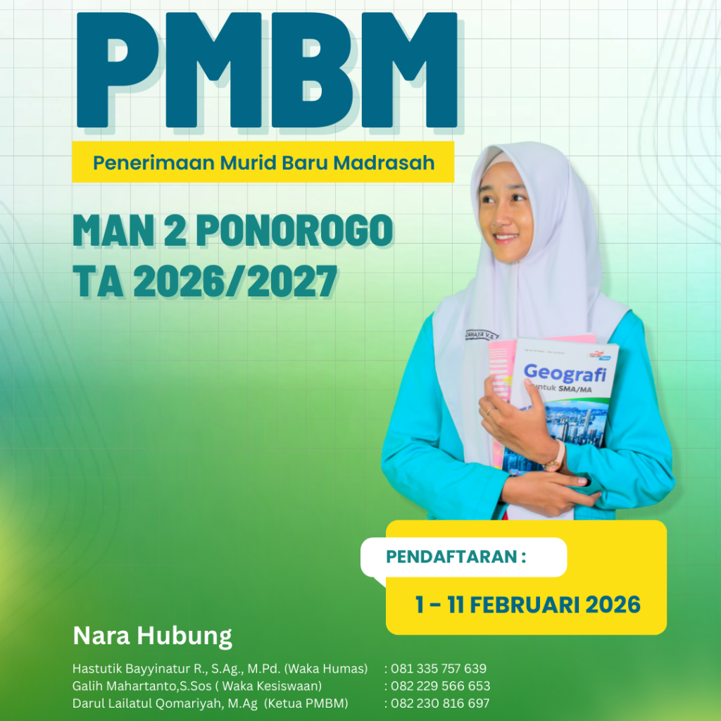 MAN 2 Ponorogo adalah alih fungsi dari PGAN Ponorogo pada tanggal 1 Juli 1992, Dalam upaya meningkatkan mutu pendidikan di MAN 2 Ponorogo terdapat kerjasama yang sangat baik antara siswa, tenaga pendidik, tenaga non kependidikan dan komite dengan perannya masing-masing. MAN 2 Ponorogo merupakan salah satu madrasah aliyah negeri di Kabupaten Ponorogo yang berkualitas. Dengan mengusung visi Religius, Unggul, Berbudaya,dan Integritas (RUBI), MAN 2 Ponorogo dipercaya oleh Kementerian Agama sebagai: