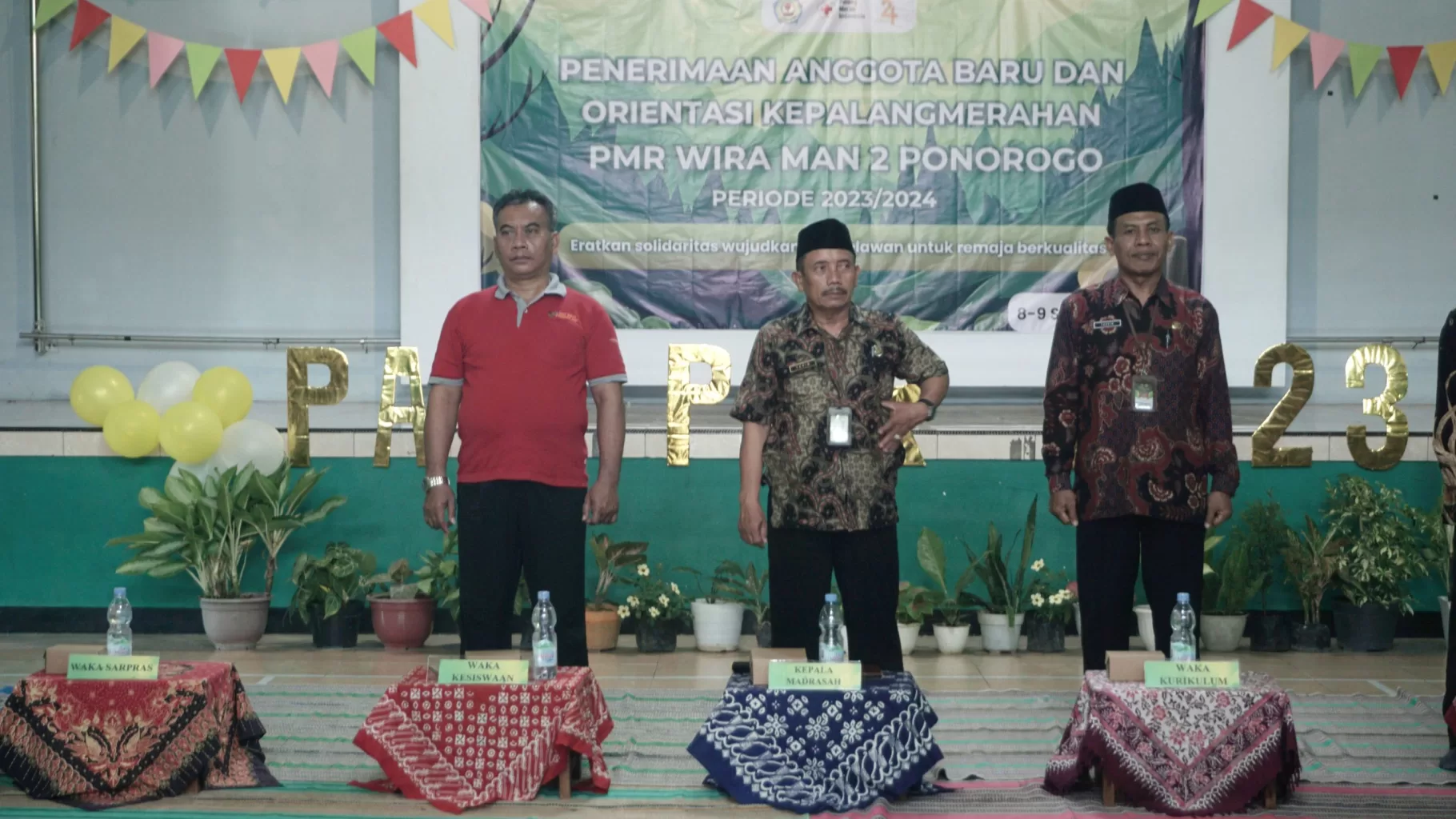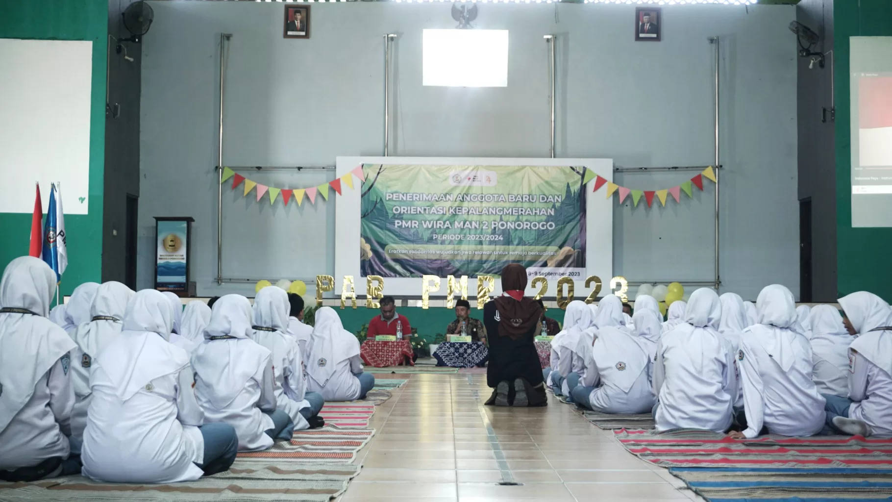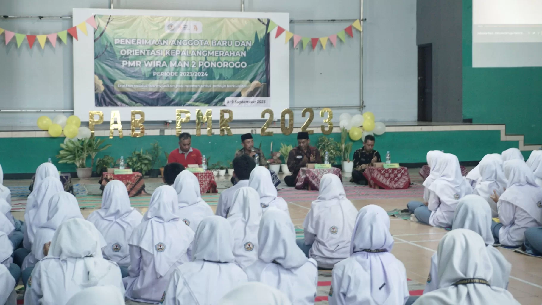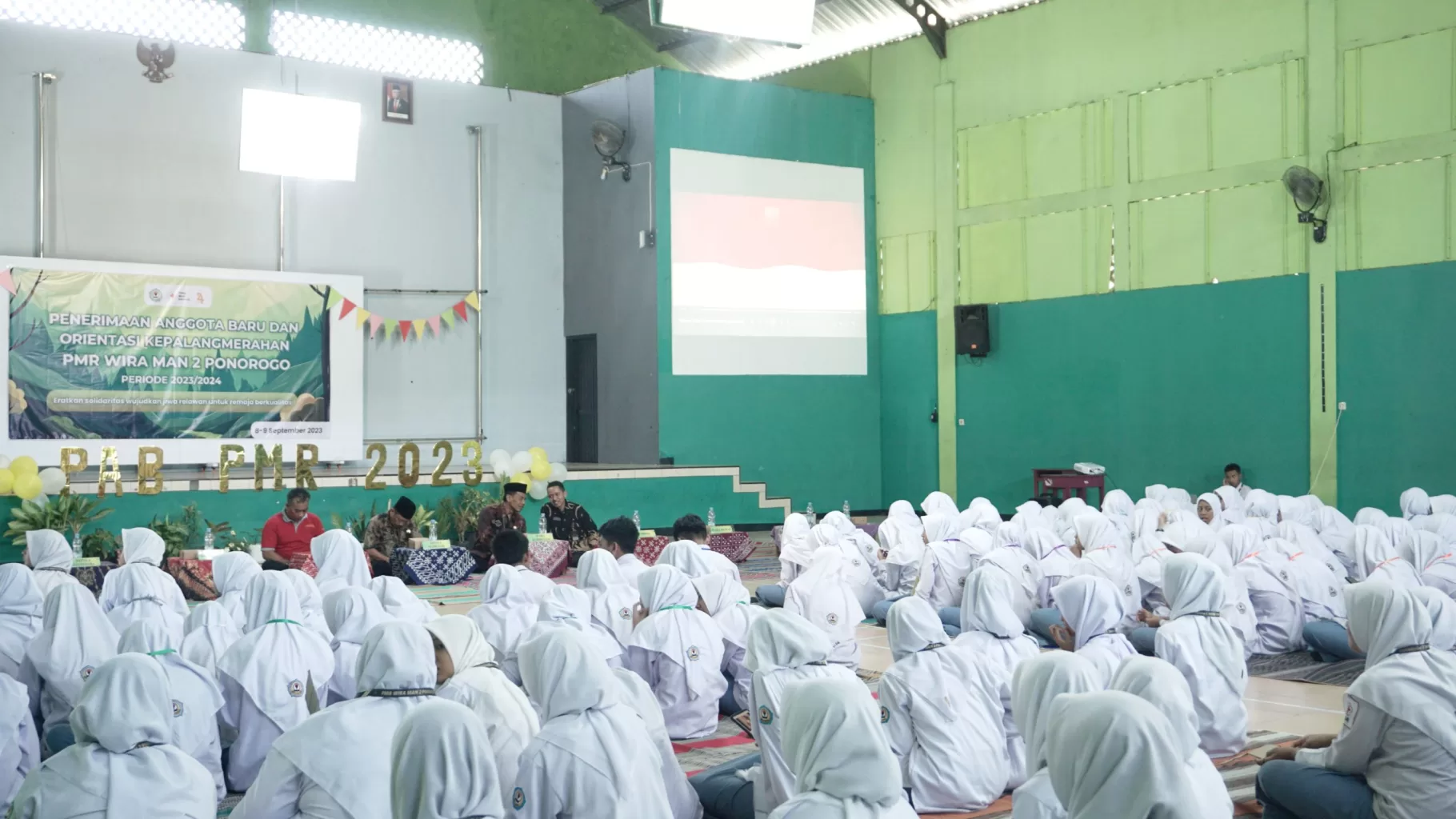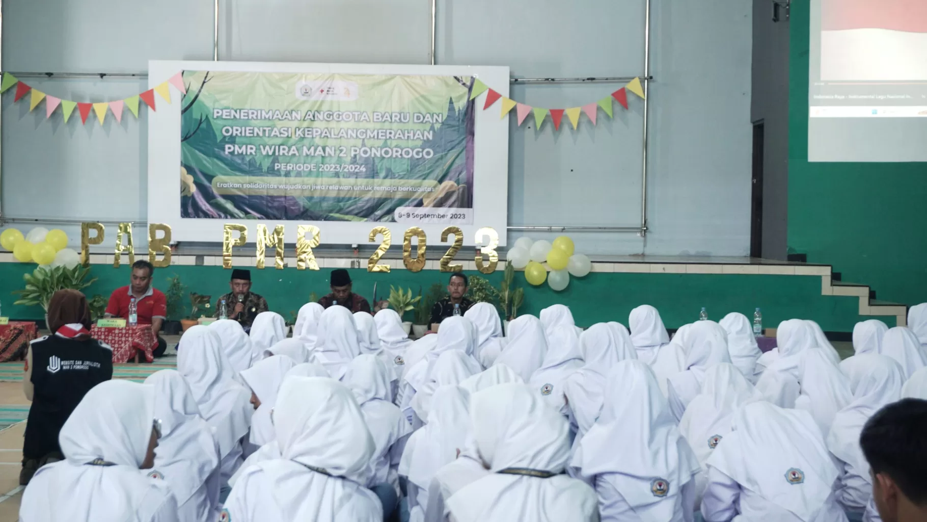 Ponorogo, 8 Agustus 2023. PMR Wira MAN 2 Ponorogo mengadakan PAB (Penerimaan Anggota Baru) yang di laksanakan 2 hari berturut-turut pada 8-9 September 2023. Acara ini berjalan dengan lancar yang berlokasi di GOR MAN 2 Ponorogo, dan diikuti sebanyak 83 siswa. Pembukaan acara ini ditandai dengan penyematan tanda peserta oleh Bapak Drs.Tarib, M.Pd.I selaku kepala madrasah. Acara ini juga dihadiri 2 pemateri yaitu dari PMI yang diwakili  Nugraha Kresna Mukti dengan materi “sejarah kepalangmerahan, tri bakti dan 7 prinsip”, dan Bpk Heri Sunaryadi, S.Pd selaku guru BK di Madrasah dengan materi yang dibawakan yaitu “Obat Obatan”.