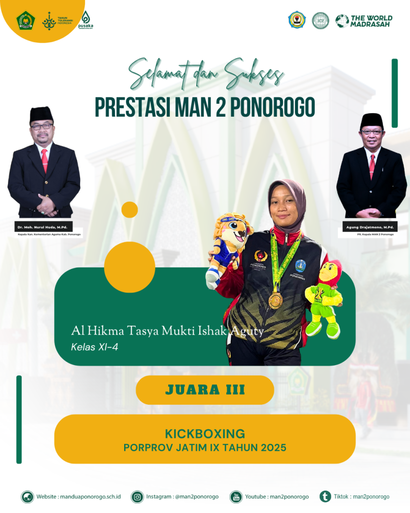 Ponorogo (30 Juni 2025). Prestasi membanggakan kembali diraih oleh siswa MAN 2 Ponorogo. Al Hikma Tasya Mukti Ishak Aguty dari kelas XI-4, berhasil meraih Juara 3 dalam ajang Pekan Olahraga Provinsi (PORPROV) Jawa Timur IX tahun 2025 cabang olahraga kickboxing. Perlombaan ini diselenggarakan oleh KONI Jawa Timur dan berlangsung di Kota Malang pada 24-28 Juni 2025.