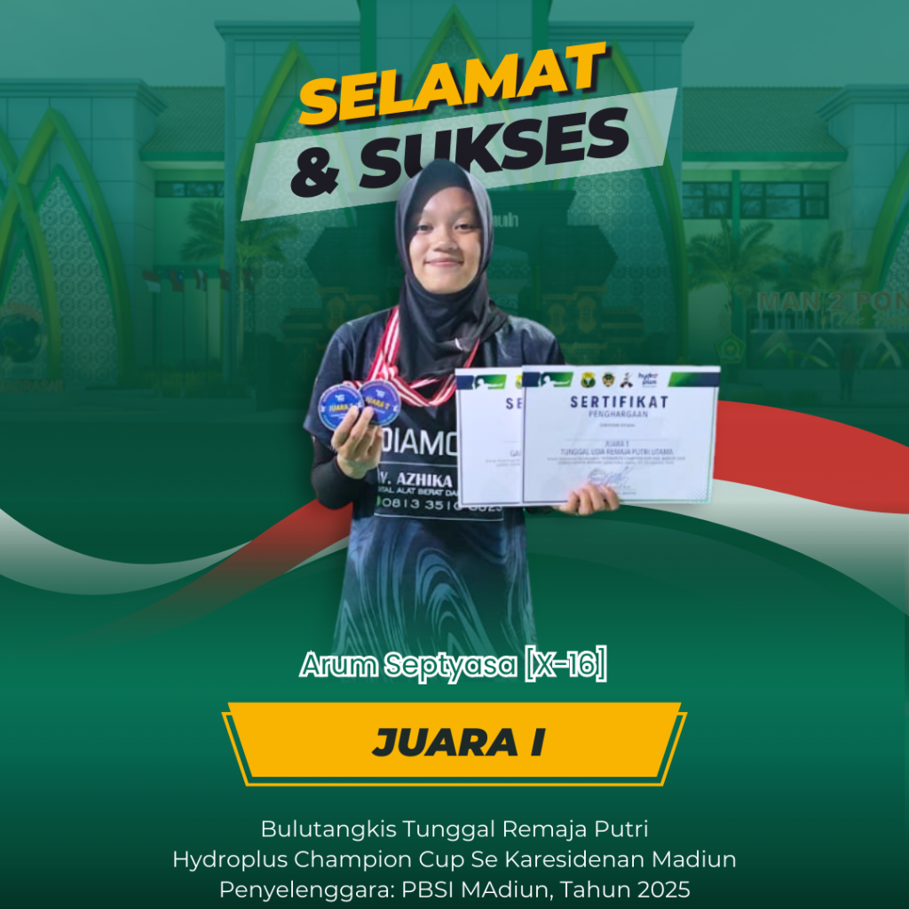 Madiun (31/8) – Ajang pertandingan bulutangkis yang digelar di LARAIA Sport, Madiun, menjadi momen berharga bagi siswi MAN 2 Ponorogo, Arum Septyasa dari kelas X-16. Arum berhasil menorehkan prestasi membanggakan dengan meraih Juara 1 Tunggal Remaja Putri serta Juara 2 Ganda Remaja Putri yang diselenggarakan oleh PBSI Madiun.