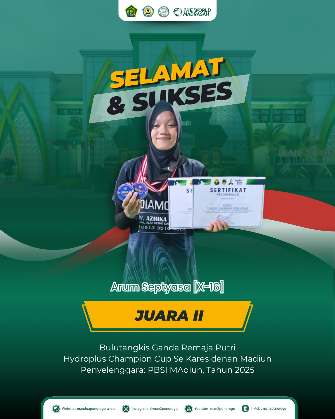 Madiun (31/8) – Ajang pertandingan bulutangkis yang digelar di LARAIA Sport, Madiun, menjadi momen berharga bagi siswi MAN 2 Ponorogo, Arum Septyasa dari kelas X-16. Arum berhasil menorehkan prestasi membanggakan dengan meraih Juara 1 Tunggal Remaja Putri serta Juara 2 Ganda Remaja Putri yang diselenggarakan oleh PBSI Madiun.