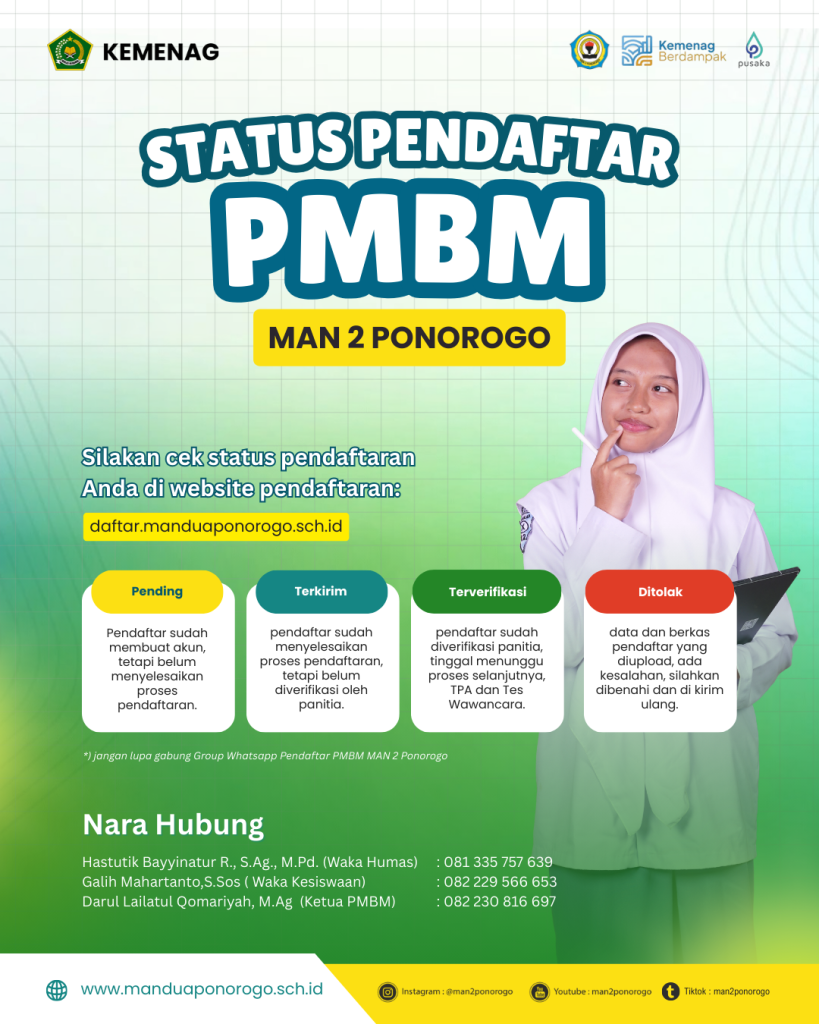 Bagi calon peserta didik baru MAN 2 Ponorogo, pastikan kamu sudah mengecek status pendaftaran PMBM-mu ya! โจ