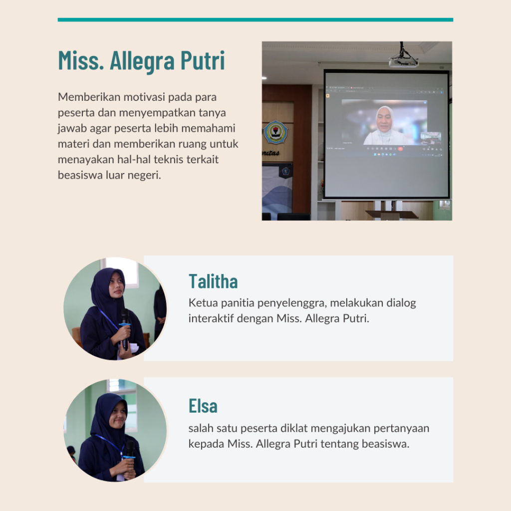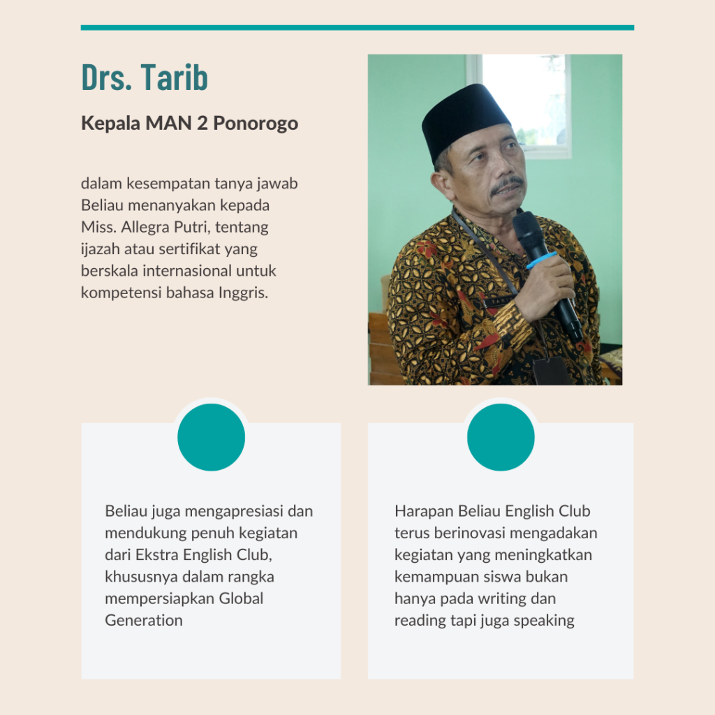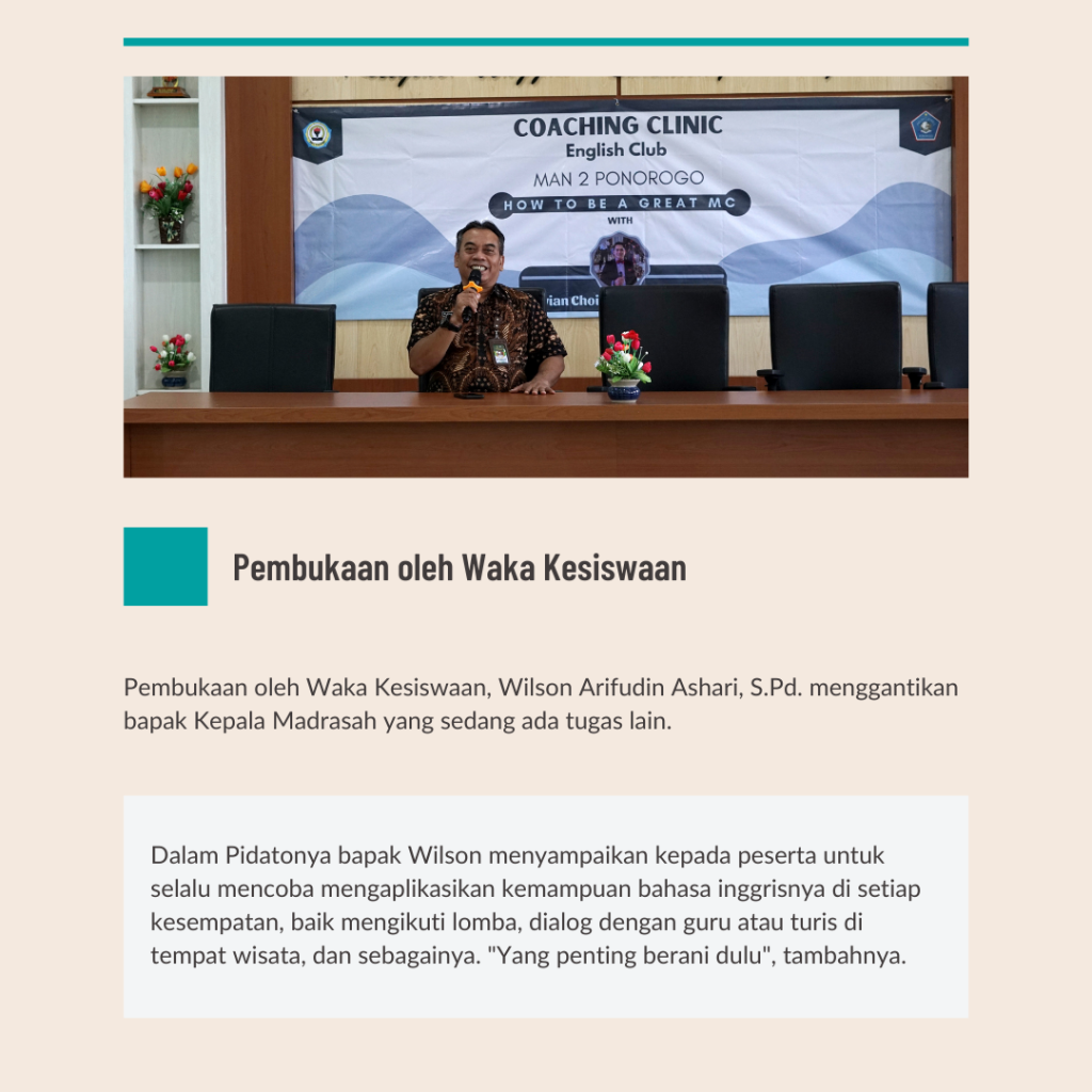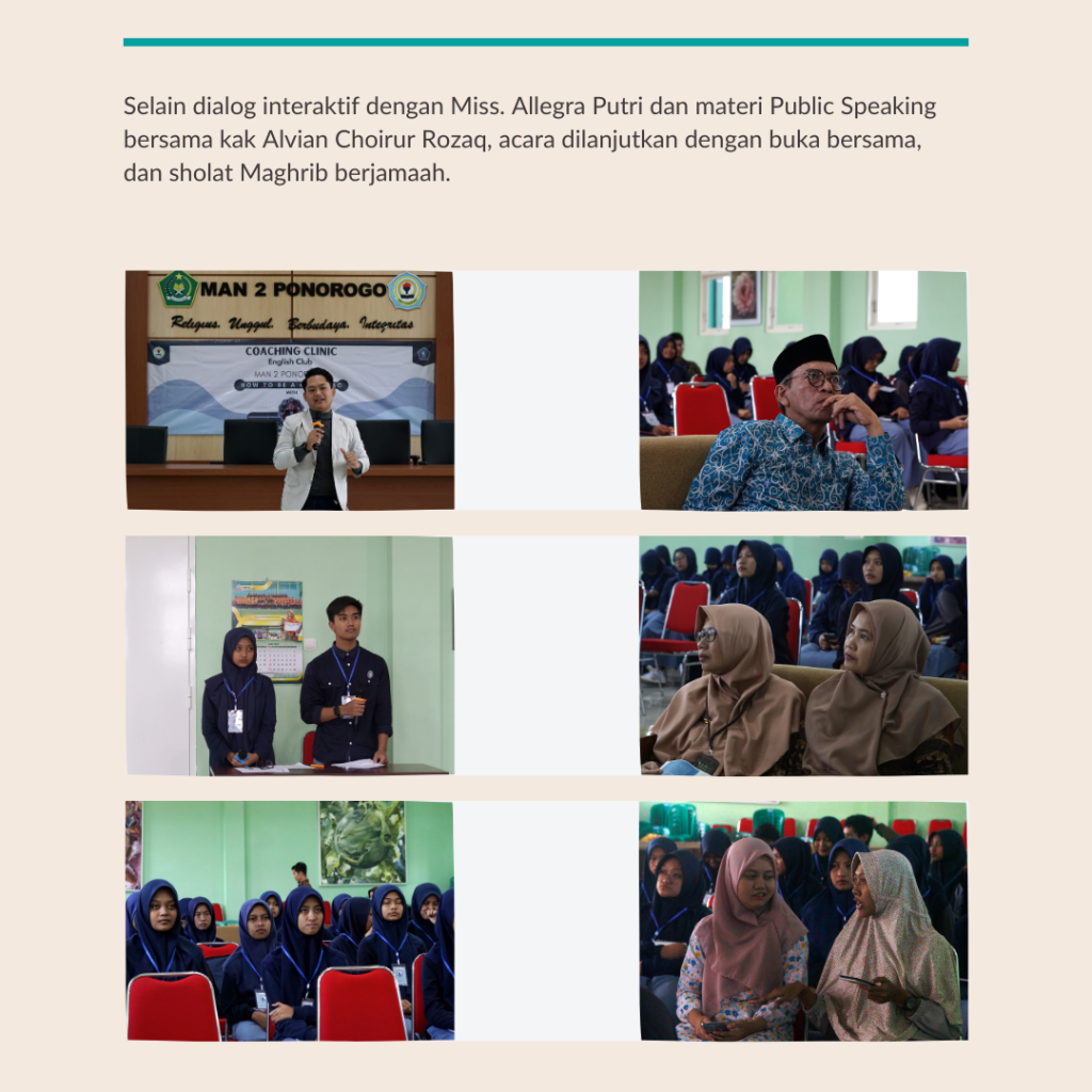 Ponorogo, Sabtu 8/4/2023-English Club MAN 2 Ponorogo sekali lagi menyelenggarakan acara menarik yaitu Coaching Clinic, How to be the Great MC. English Club menerima partisipan tidak hanya dari anggota English Club tapi partisipan secara umum siswa kelas X dan kelas XI MAN 2 Ponorogo. Coaching clinic ini diawali dengan materi dari kak Allegra Putri Kartika dari Generation Global. Kak Allegra memberikan kesempatan kepada peserta untuk bertanya seputar program Generation Global.