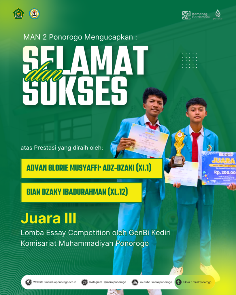 Ponorogo 4/2/2026 — Prestasi membanggakan kembali diraih oleh siswa MAN 2 Ponorogo. Advan Glorie Musyaffi’ Adz-Dzaki XI-1 dan Gian Dzaky Ibadurahman XI-12, berhasil meraih Juara III dalam Lomba Essay Competition yang diselenggarakan oleh GenBI Kediri Komisariat Muhammadiyah Ponorogo.
