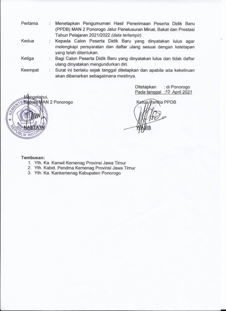 - Surat Keputusan Panitia PPDB MAN 2 Ponorogo Nomor : 27 Tahun 2021 tentang Pengumuman Hasil Seleksi Penerimaan Peserta Didik Baru (PPDB) Jalur Penelusuran Minat, Bakat dan Prestasi Madrasah Aliyah Negeri 2 Ponorogo Tahun Pelajaran 2021/2022.