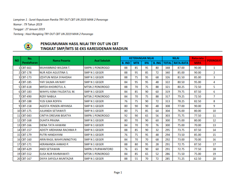 Hasil Try Out CBT SMP-MTs Se-Karesidenan Madiun Tahun 2019 bisa di download disini.
