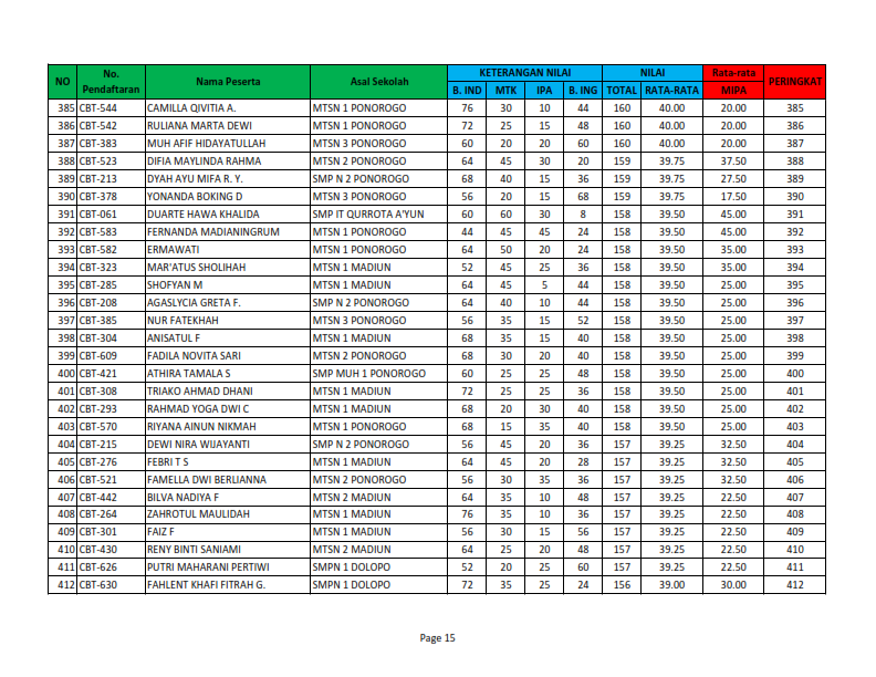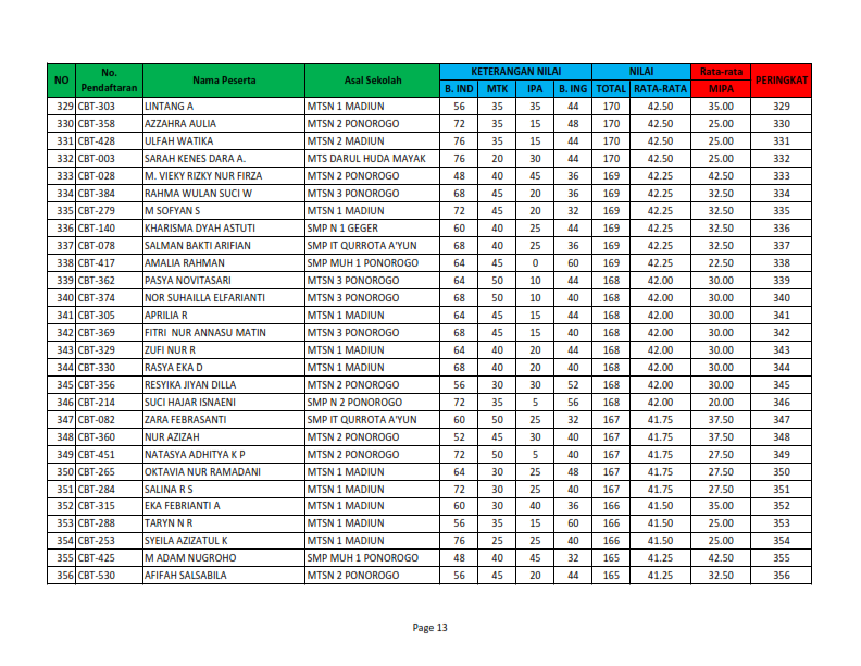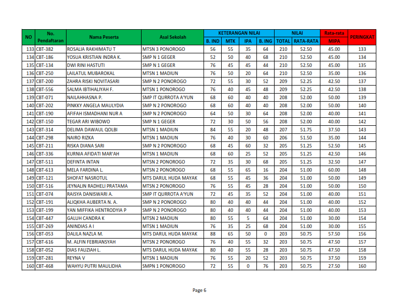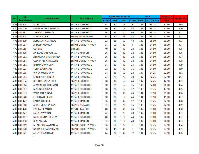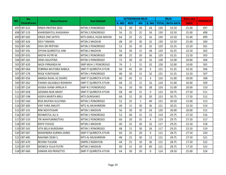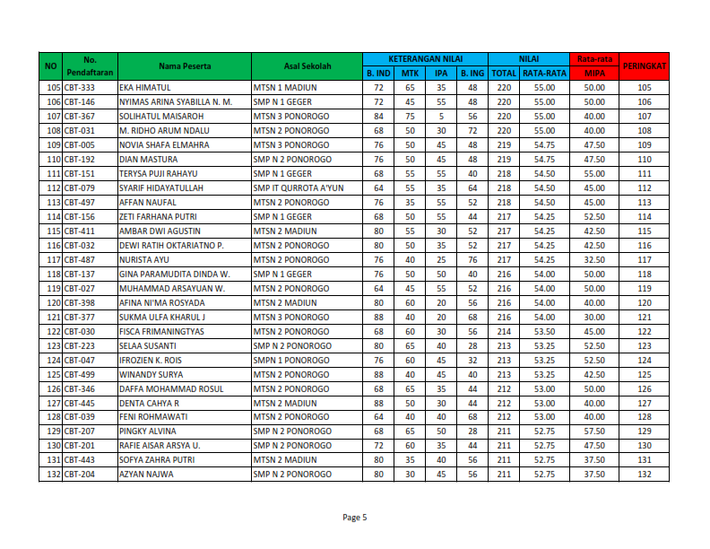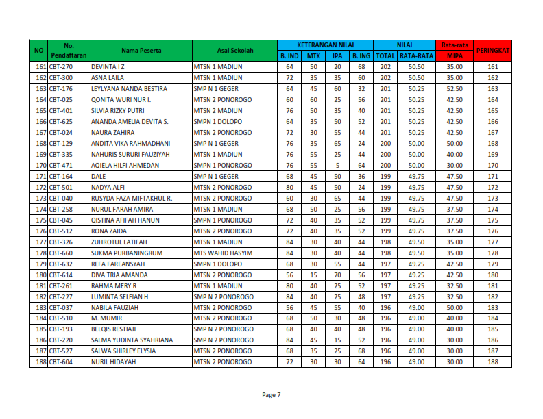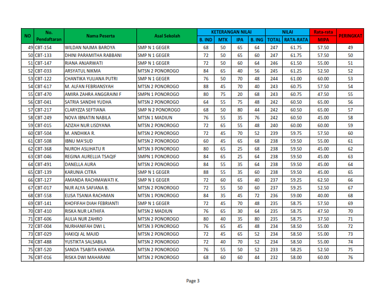Rangking diambil berdasarkan Total Nilai, Rata-Rata MIPA, Nilai MTK, Nilai IPA, Nilai B. Inggris, kemudian Nilai B. Indonesia.