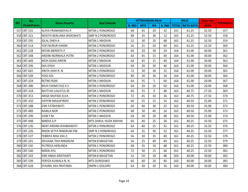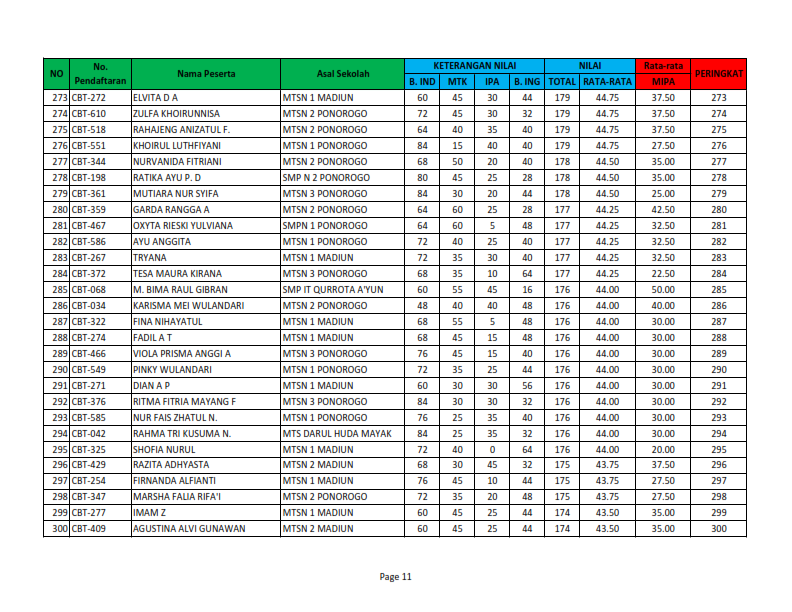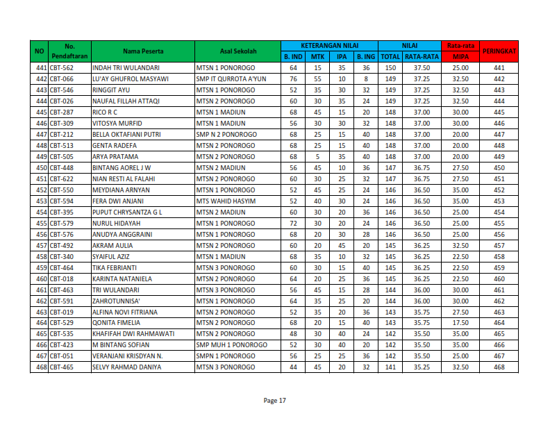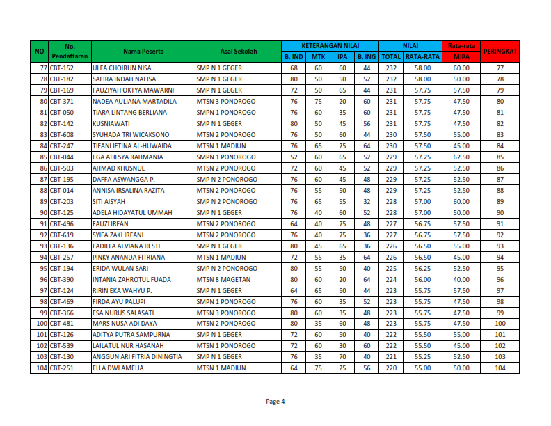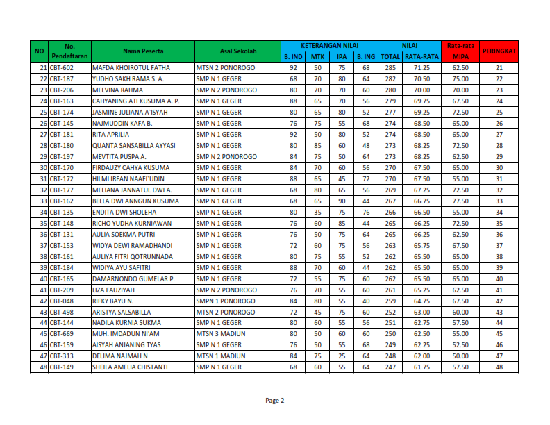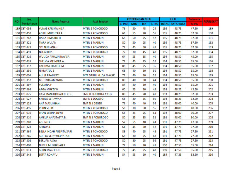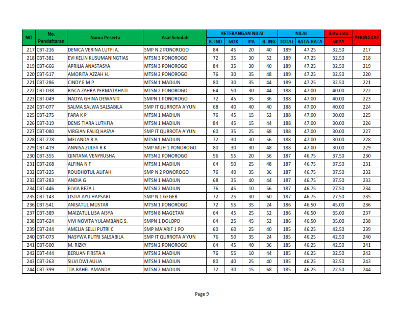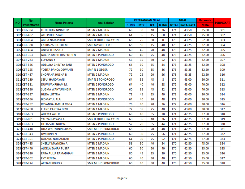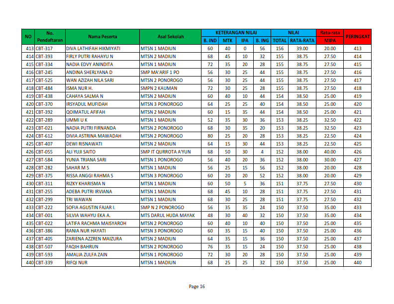 Rangking diambil berdasarkan Total Nilai, Rata-Rata MIPA, Nilai MTK, Nilai IPA, Nilai B. Inggris, kemudian Nilai B. Indonesia.