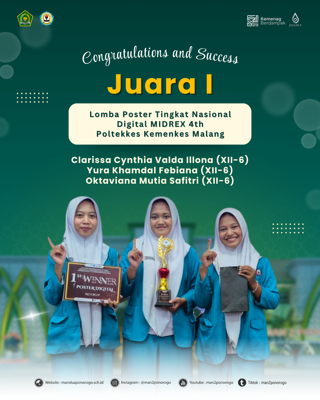 Ponorogo (19/12/2025) – Siswi MAN 2 Ponorogo kembali menorehkan prestasi membanggakan di tingkat nasionalSatu tim yang terdiri dari Yura Khamdal Febiana, Clarissa Cynthia Valda Illona, dan Oktaviana Mutia Safitri berhasil meraih Juara 1 Lomba Poster Digital MINDCREX 4th Tingkat Nasional. Keberhasilan ini menjadi bukti kreativitas dan kerja sama tim yang solid dalam ajang bergengsi tingkat nasional.