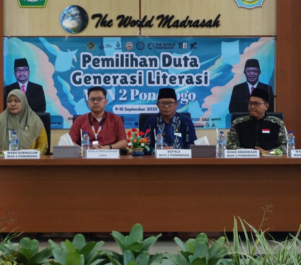 Ponorogo, (10/09/2025) – MAN 2 Ponorogo sukses menyelenggarakan ajang Pemilihan Duta Generasi Literasi ( Gen-Lit) Periode 2025–2026 yang berlangsung dengan meriah di Aula MAN 2 Ponorogo. Acara ini diawali dengan pembacaan ayat suci Al-Qur’an oleh Hifza Arvadya kelas XI-9, dilanjutkan menyanyikan lagu Indonesia Raya yang dibawakan oleh Ayudina, serta sambutan dari Atiq Wirawati selaku Ketua Perpustakaan Darul Ilmi,.
