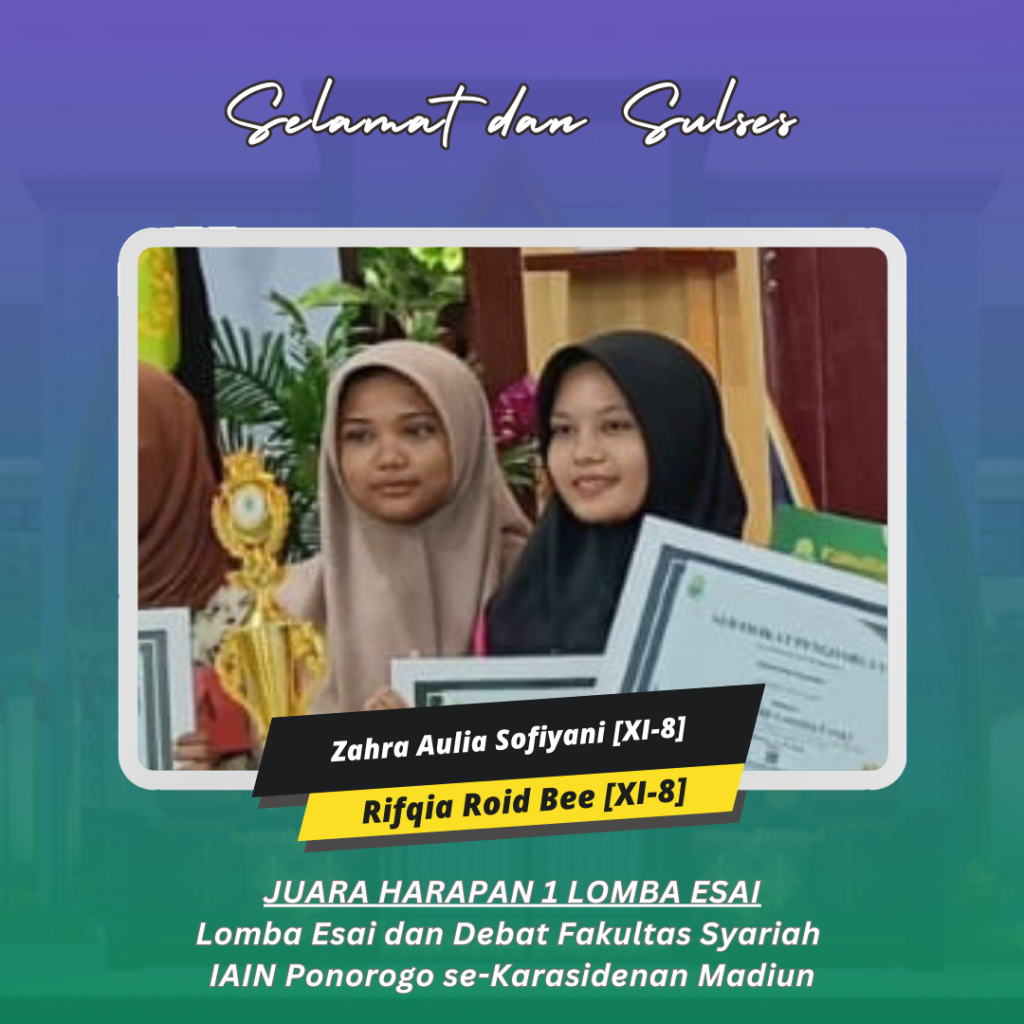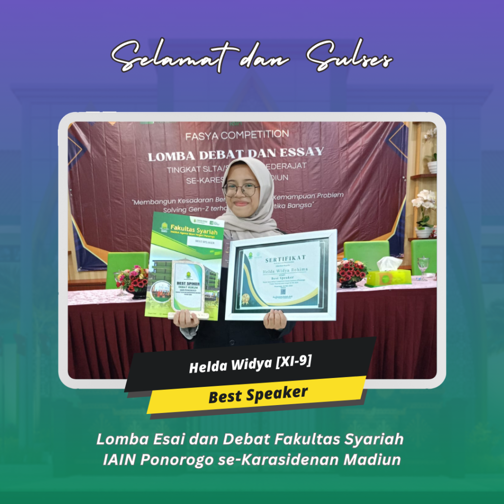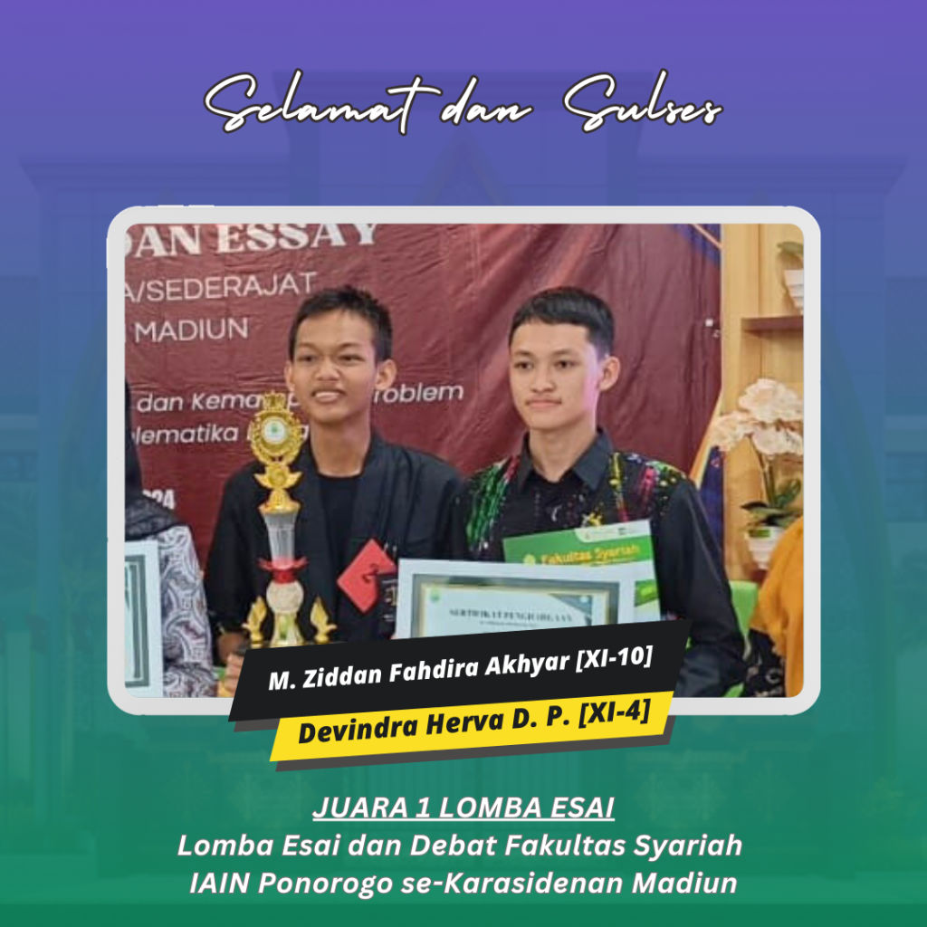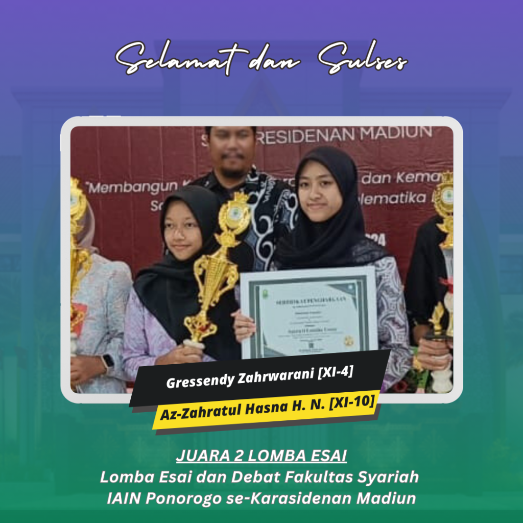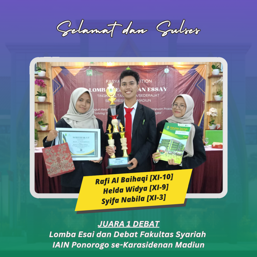 Ponorogo (26/5/24) Kehadiran tim MAN 2 Ponorogo dalam lomba essay dan debat Fakultas Syariah IAIN Ponorogo se-karasidenan Madiun bukan sekedar tentang meraih kemenangan tetapi juga tentang menyalurkan pesan dan makna yang dalam. Kejuaraan yang mereka persembahkan adalah : Juara 1 Lomba Esai oleh Muhammad Ziddan Fahdira Akhyar (XI-10) dan Devindra Herva Dwi Putra (XI-4); Juara 2 Lomba Esai oleh Gressendy Zahrwarani (XI-4) dan Az-Zahratul Hasna Happy Navisa (XI-10) ; Juara Harapan 1 Lomba Esai oleh Zahra Aulia Sofiyani (XI-8) dan Rifqia Roid Bee (XI-8); Juara 1 Debat oleh Rafi Al Baihaqi (XI-10), Helda Widya (XI-9), dan Syifa Nabila (XI-3) serta Best Speaker oleh Helda Widya (XI-9).