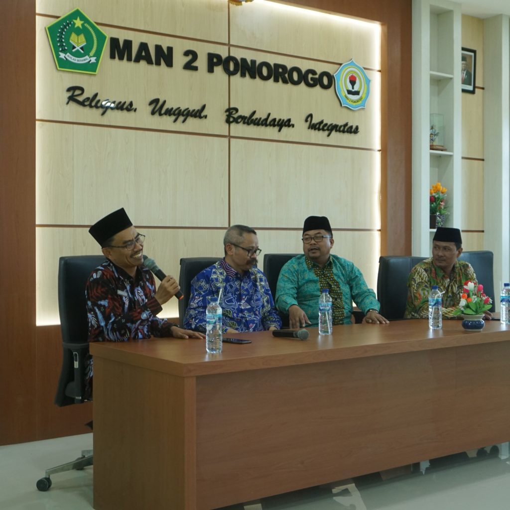 Sabtu, 05/11/2022. MAN 2 Ponorogo mendapatkan kunjungan dari Kepala Subdit Kurikulum dan Evaluasi Direktorat KSKK Madrasah Kemenag RI, Dr. Suwardi, M. Pd. beserta rombongan yang disambut langsung oleh Kepala Madrasah, Bapak Nastain, S. Pd. M. Pd. I. beserta seluruh guru dan karyawan MAN 2 Ponorogo. Kedatangan Kepala Direktorat KSKK Kemenag RI adalah dalam rangka memberikan arahan tentang program Kelas Internasional, yang dilaksanakan di Aula MAN 2 Ponorogo.