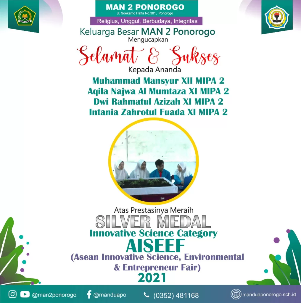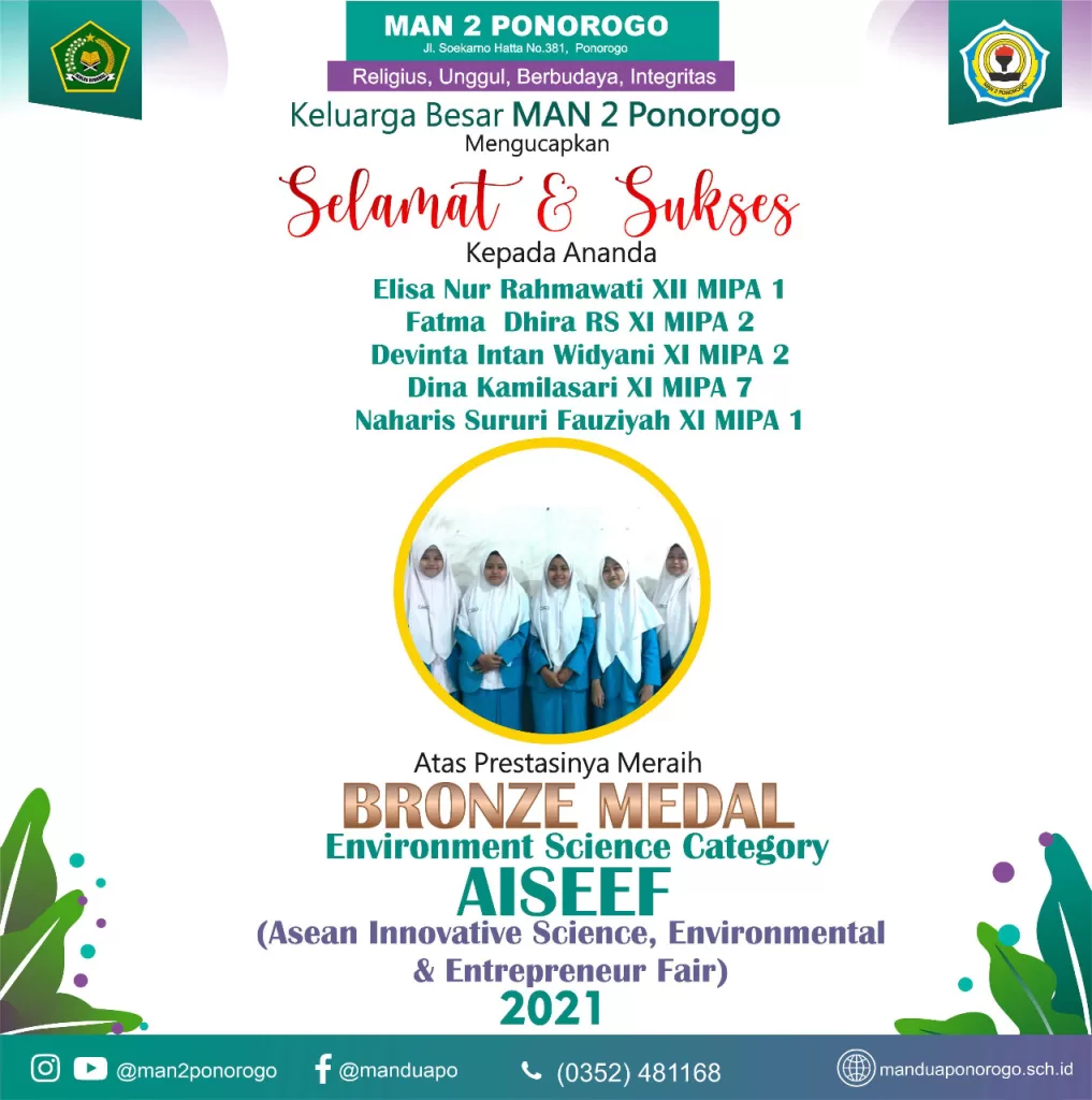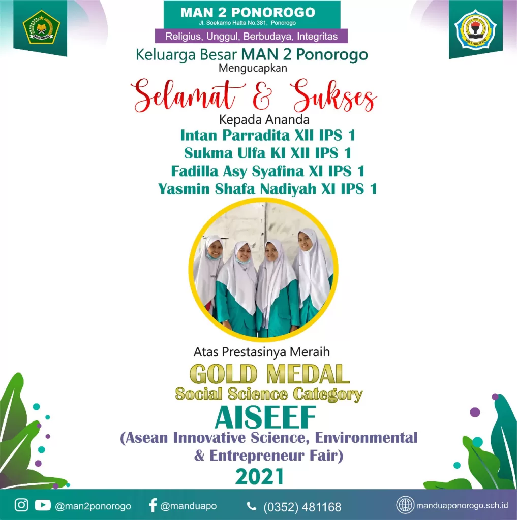 Selasa, 23/2/2021. Berita menggembirakan kembali hadir di MAN 2 Ponorogo setelah diumumkannya para pemenang dalam kompetensi bergengsi AISEF (Asean Innovation Science and Entreprenur Fair) 2021. Kompetisi yang diselenggarakan oleh Asosiasi ilmuwan muda Indonesia bekerjasama dengan IPB, UNDIP, UDINUS, I3L, dan Yayasan Prestasi Pendidik Indonesia untuk yang kedua kalinya ini memang mencari para siswa dan mahasiswa yang mampu berinovasi. Motto yang diusung dalam even ini adalah “inovasi menjadi sebuah keharusan, karena dengan inovasi akan ada temuan baru”. Ada beberapa kategori yang dilombakan, yaitu Entrepeneur, Social science, Environmental science,dan Innovation science.