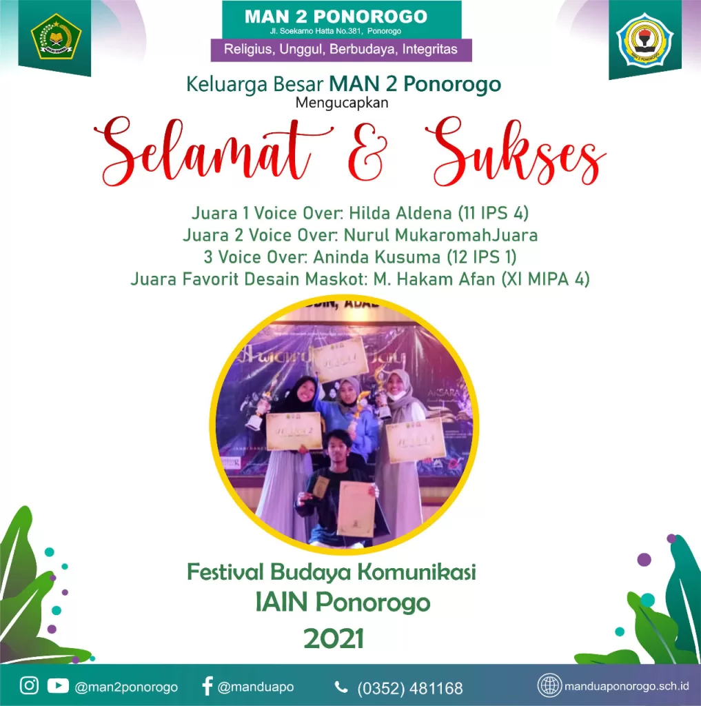 Sabtu, 20/2/2021. Event Festival Budaya Komunikasi  yang diselenggarakan oleh IAIN Ponorogo seolah menjadi ajang unjuk gigi para siswa MAN 2 Ponorogo. Kegiatan yang telah dilaksanakan sejak tanggal 11 Februari 2021 sampai tanggal  20 Februari 2021 tersebut diikuti oleh 13 peserta perwakilan dari MAN 2 Ponorogo. Alhamdulillah 4 dari 13 perwakilan MAN 2 Ponorogo meraih juara yaitu : Juara 1 Voice Over yang diraih oleh Hilda Aldena (11 IPS 4);  Juara 2 Voice Over diperoleh Nurul Mukaromah; Juara 3 Voice Over dimenangkan oleh Aninda Kusuma (12 IPS 1) dan Juara Favorit Desain Maskot direbut oleh M. Hakam Afan (11 MIPA 4).