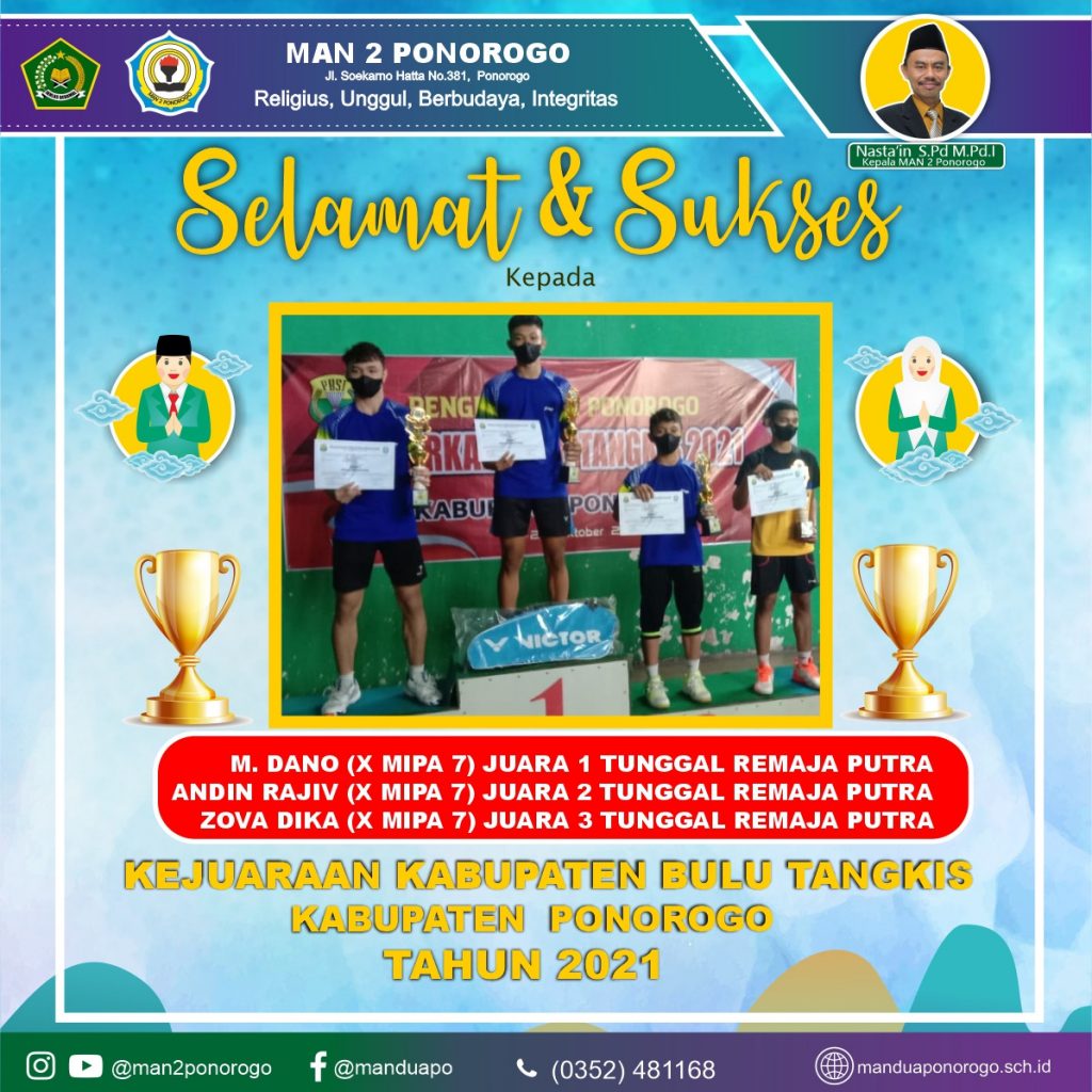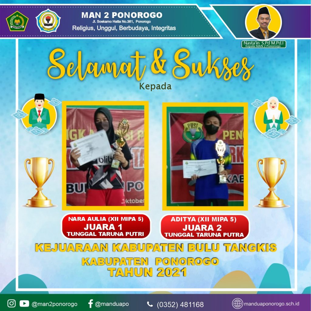 25 Oktober 2021. Nama MAN 2 Ponorogo kembali mengharum di wilayah kabupaten Ponorogo. Beberapa siswa meraih juara dalam Kejurkab Bulu Tangkis Kabupaten Ponorogo tahun 2021 yang diselenggarakan oleh PBSI (Persatuan Bulu tangkis Seluruh Indonesia) pada tanggal 21-24 Oktober 2021. Kegiatan lomba dilaksanakan di GOR Singodimedjo.