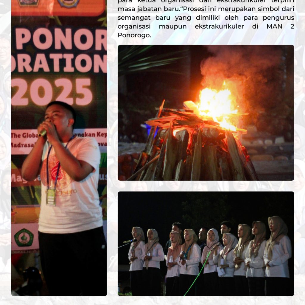Pada malam harinya, acara berlanjut dengan prosesi penyalaan api unggun. Api unggun dinyalakan oleh para ketua organisasi dan ekstrakurikuler terpilih masa jabatan baru.“Prosesi ini merupakan simbol dari semangat baru yang dimiliki oleh para pengurus organisasi maupun ekstrakurikuler di MAN 2 Ponorogo. Harapannya, kepengurusan baru dapat lebih baik dan berinovasi,” tutur Alfi Budi, selaku Ketua Panitia Guru.Selepas penyalaan api unggun, acara dilanjutkan dengan pentas seni yang dipersembahkan oleh para pengurus baru dari setiap kelompok. Berbagai penampilan kreatif, mulai dari musik hingga teatrikal, membuat suasana malam semakin hangat dan penuh keceriaan.