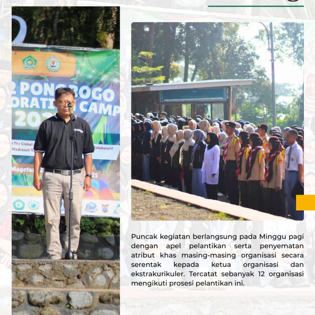 Puncak kegiatan berlangsung pada Minggu pagi dengan apel pelantikan serta penyematan atribut khas masing-masing organisasi secara serentak kepada ketua organisasi dan ekstrakurikuler. Tercatat sebanyak 12 organisasi mengikuti prosesi pelantikan ini. Dalam amanatnya, Agung Drajatmono menyampaikan apresiasi mendalam kepada pengurus lama yang telah mengabdi, sekaligus memberikan pesan kepada pengurus baru.“Saya berterima kasih kepada seluruh pengurus lama atas dedikasi yang telah diberikan. Untuk pengurus baru, mari belajar dari pengalaman para pendahulu, saling bekerja sama, dan terus menjaga kekompakan. Kita tidak bisa berdiri sendiri, melainkan harus bersatu demi kemajuan MAN 2 Ponorogo,” pesan Agung.