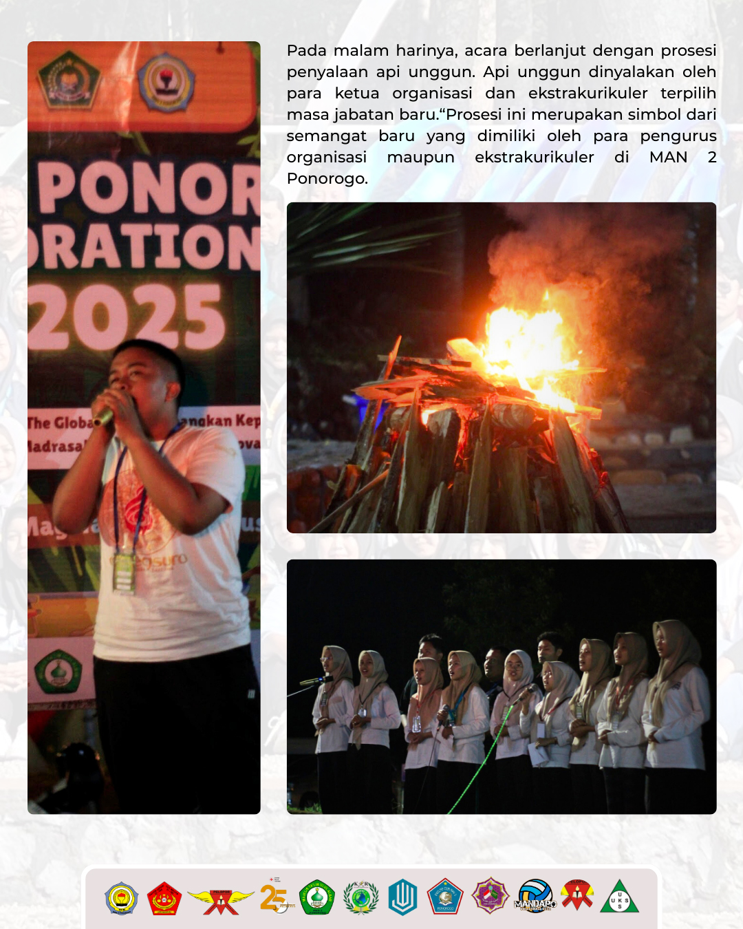 Pada malam harinya, acara berlanjut dengan prosesi penyalaan api unggun. Api unggun dinyalakan oleh para ketua organisasi dan ekstrakurikuler terpilih masa jabatan baru.“Prosesi ini merupakan simbol dari semangat baru yang dimiliki oleh para pengurus organisasi maupun ekstrakurikuler di MAN 2 Ponorogo. Harapannya, kepengurusan baru dapat lebih baik dan berinovasi,” tutur Alfi Budi, selaku Ketua Panitia Guru.Selepas penyalaan api unggun, acara dilanjutkan dengan pentas seni yang dipersembahkan oleh para pengurus baru dari setiap kelompok. Berbagai penampilan kreatif, mulai dari musik hingga teatrikal, membuat suasana malam semakin hangat dan penuh keceriaan.