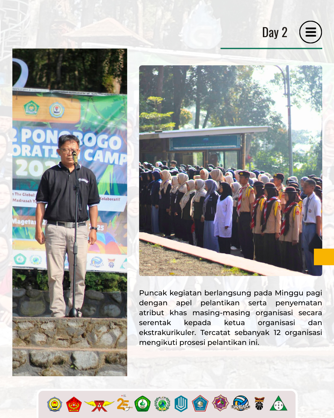 Puncak kegiatan berlangsung pada Minggu pagi dengan apel pelantikan serta penyematan atribut khas masing-masing organisasi secara serentak kepada ketua organisasi dan ekstrakurikuler. Tercatat sebanyak 12 organisasi mengikuti prosesi pelantikan ini. Dalam amanatnya, Agung Drajatmono menyampaikan apresiasi mendalam kepada pengurus lama yang telah mengabdi, sekaligus memberikan pesan kepada pengurus baru.“Saya berterima kasih kepada seluruh pengurus lama atas dedikasi yang telah diberikan. Untuk pengurus baru, mari belajar dari pengalaman para pendahulu, saling bekerja sama, dan terus menjaga kekompakan. Kita tidak bisa berdiri sendiri, melainkan harus bersatu demi kemajuan MAN 2 Ponorogo,” pesan Agung.