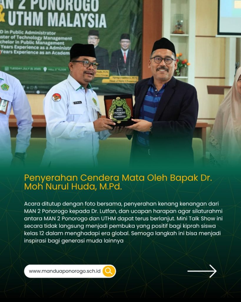Acara ditutup dengan foto bersama, penyerahan kenang‑kenangan dari MAN 2 Ponorogo kepada Dr. Lutfan, dan ucapan harapan agar silaturahmi antara MAN 2 Ponorogo dan UTHM dapat terus berlanjut. Mini Talk Show ini secara tidak langsung menjadi pembuka yang positif bagi kiprah siswa kelas XII dalam menghadapi era global. Semoga langkah ini bisa menjadi inspirasi bagi generasi muda lainnya.