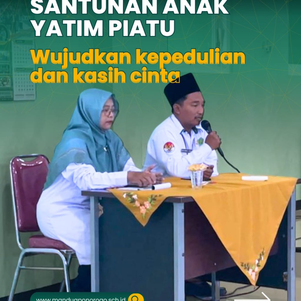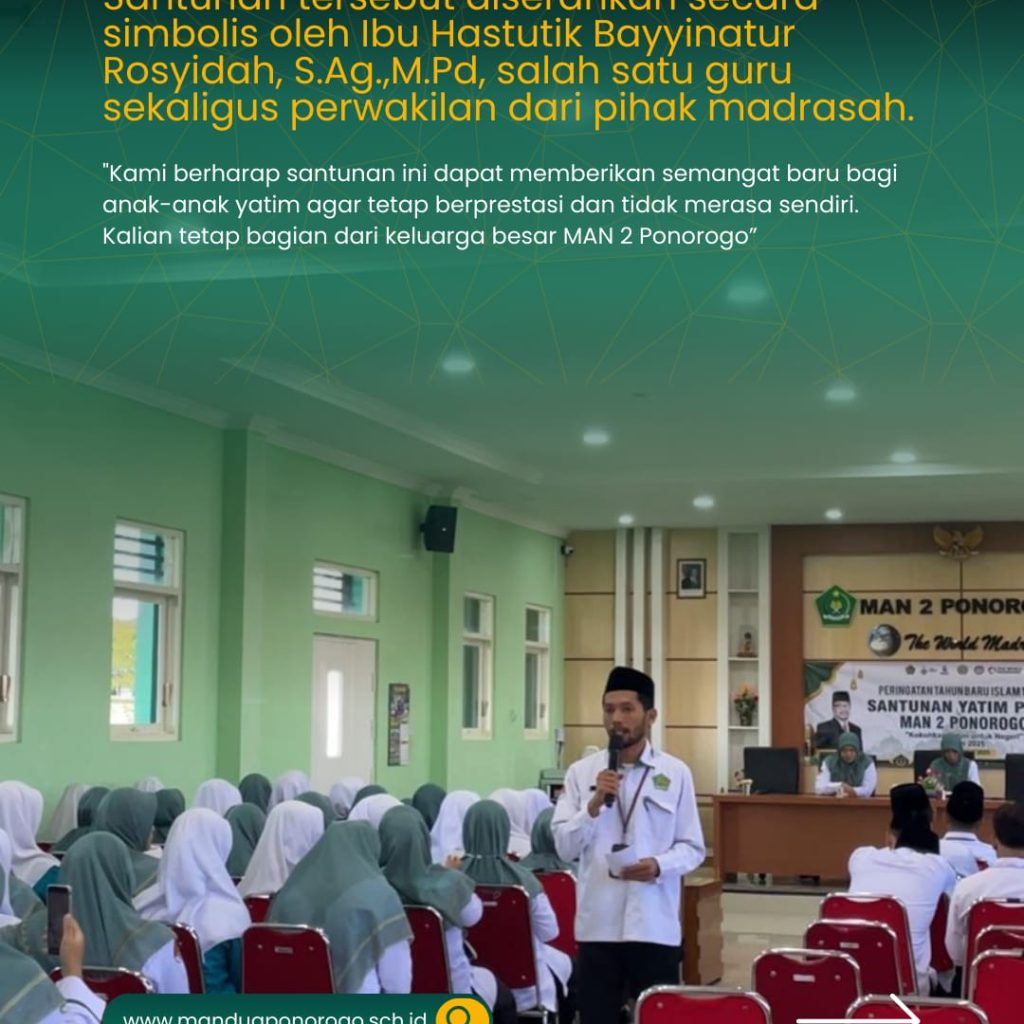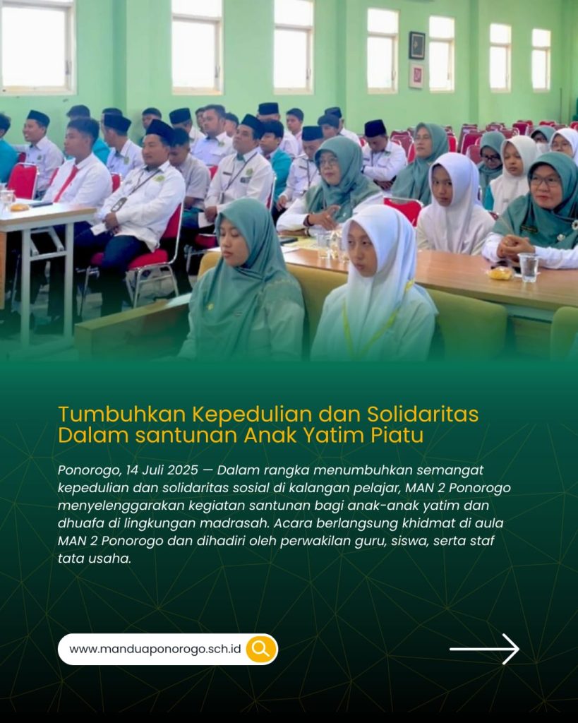Ponorogo, 14 Juli 2025 — Dalam rangka menumbuhkan semangat kepedulian dan solidaritas sosial, MAN 2 Ponorogo menyelenggarakan kegiatan santunan bagi anak-anak yatim di lingkungan madrasah. Suasana khidmat dan haru terasa di aula MAN 2 Ponorogo yang dihadiri oleh perwakilan guru, siswa, serta staf tata usaha.