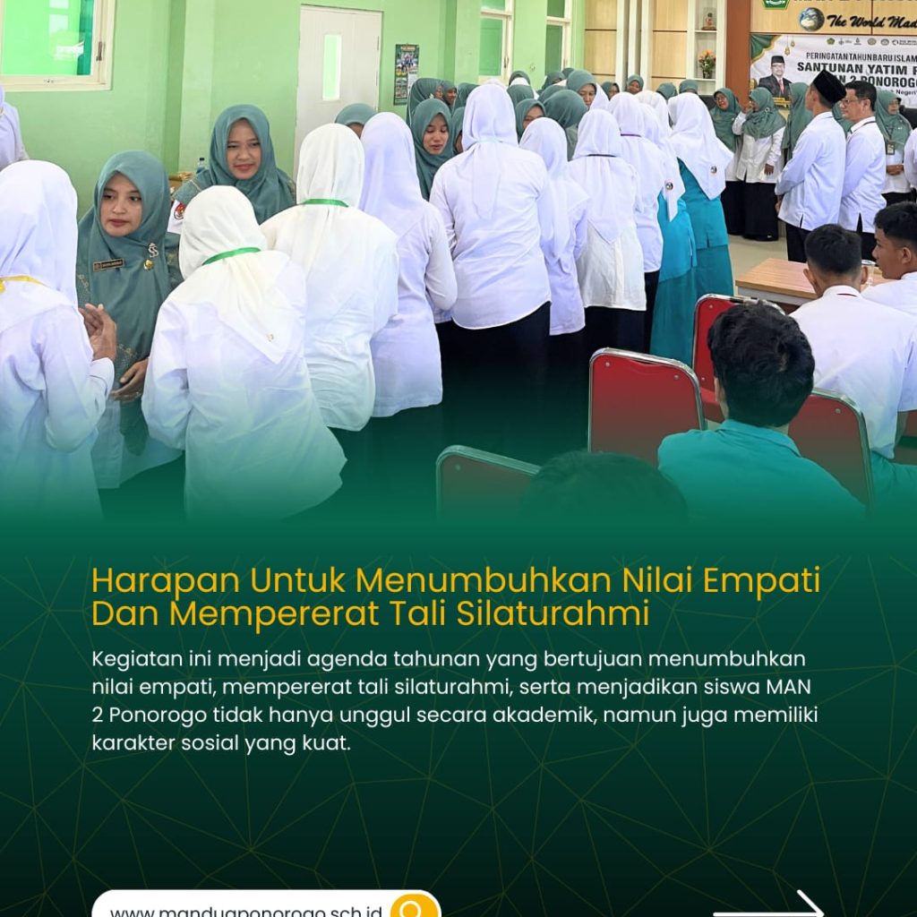 Agenda tahunan yang dilaksanakan pada bulan Muharam ini bertujuan menumbuhkan nilai empati, mempererat tali silaturahmi, serta menjadikan siswa MAN 2 Ponorogo tidak hanya unggul secara akademik, namun juga memiliki karakter sosial yang kuat.