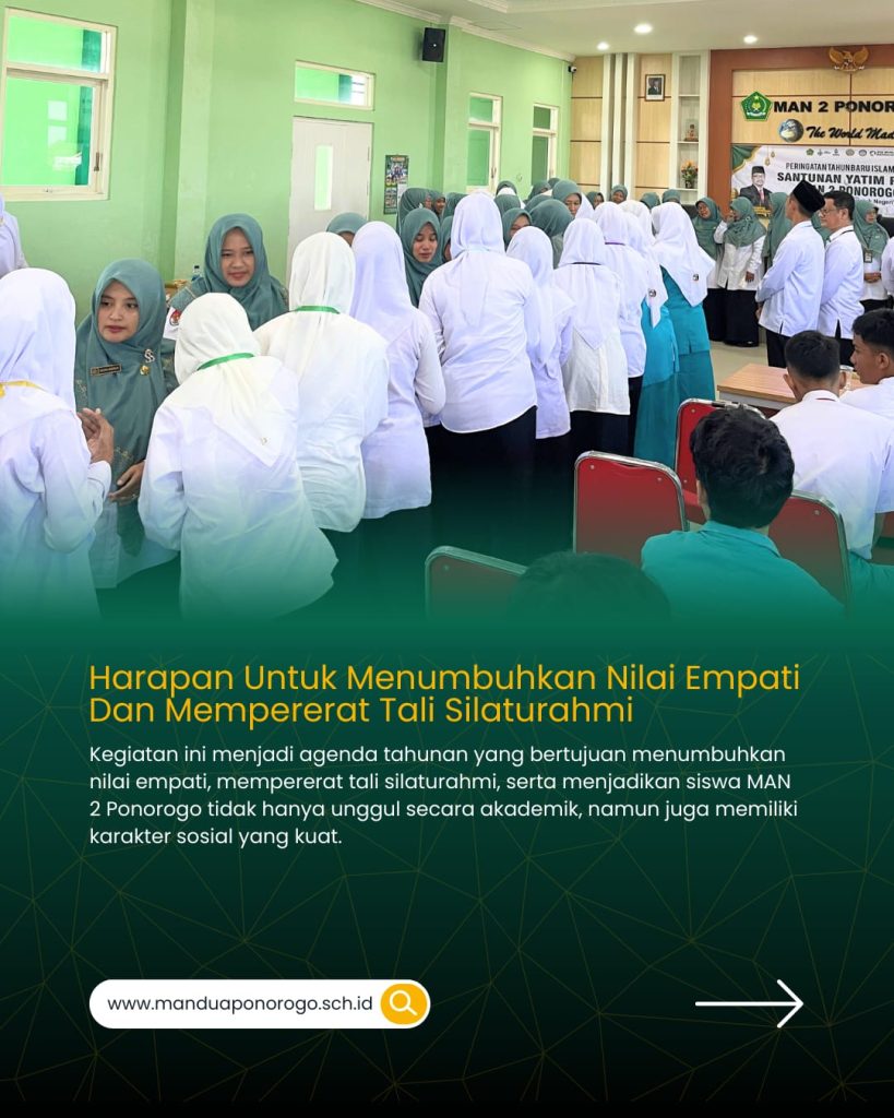 Agenda tahunan yang dilaksanakan pada bulan Muharam ini bertujuan menumbuhkan nilai empati, mempererat tali silaturahmi, serta menjadikan siswa MAN 2 Ponorogo tidak hanya unggul secara akademik, namun juga memiliki karakter sosial yang kuat.