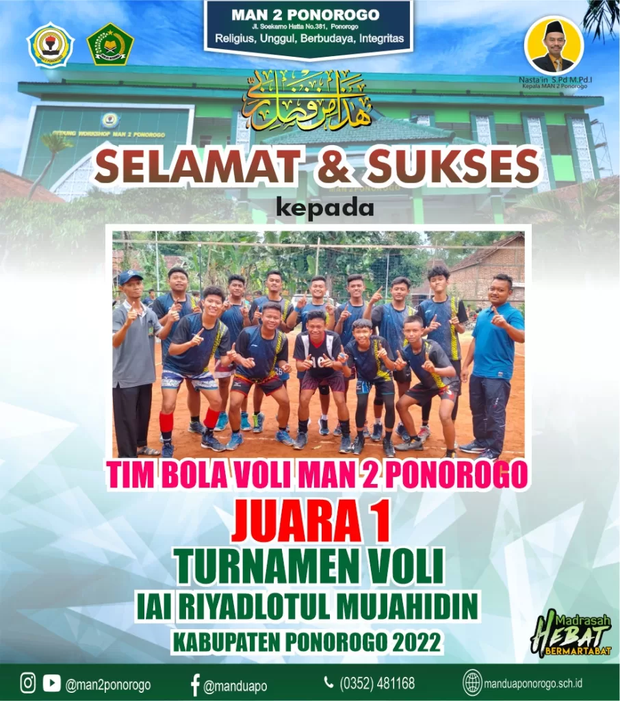 Sabtu, 12/03/2022. Tim voli MAN 2 Ponorogo mengukir prestasi dengan meraih Juara 1 dalam kejuaraan Turnamen Voli tingkat SMA/Sederajat yang diselenggarakan oleh IAI Riyadlotul Mujahidin Ngabar.