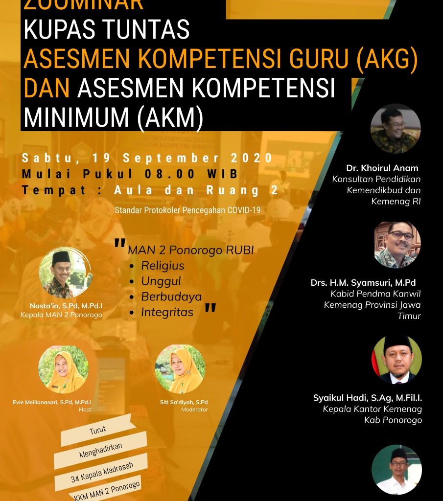 Sabtu, 19 September 2020. Sebagai akhir dari acara Workshop AKG dan AKM yang telah dimulai sejak hari Rabu (16/9/2020), MAN 2 Ponorogo menyelenggarakan Zoom Virtual Meeting pada Sabtu, 19 September 2020 dengan dihadiri oleh segenap guru dan karyawan MAN 2 Ponorogo dan sumber yaitu Drs. H.M. Syamsuri, M.Pd (Kabid Pendma Kanwil Kemenag Provinsi Jawa Timur) yang diwakili oleh Dr. H. Sugiyo dan M. Pd, Dr. Khoirul Anam (Konsultan Pendidikan Kemendikbud dan Kemenag RI). Turut serta dalam Virtual Meeting ini 34 (tiga puluh empat) Kepala Madrasah dari KKM MAN 2 Ponorogo.