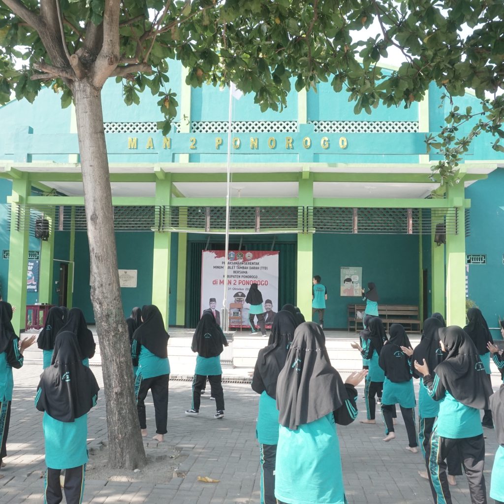 MAN 2 Ponorogo ikut memeriahkan kegiatan tersebut. Kegiatan itu dilaksanakan mulai pukul 07.00 sampai pukul 09.00 , yang diikuti oleh para siswi MAN 2 Ponorogo. Dalam pelaksanaanya terdapat beberapa serangkaian kegiatan antara lain, adalah senam, sarapan, minum tablet tambah darah, dan edukasi kesehatan. Tentunya kegiatan itu dilaksanakan secara serentak dan bersama sama di halaman depan GOR.