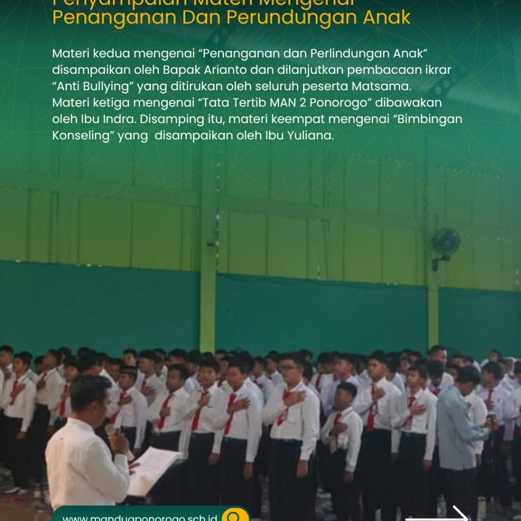 Setelah itu dilanjutkan pembacaan ikrar “Anti Bullying” yang ditirukan oleh seluruh peserta Matsama dengan tujuan agar MAN 2 Ponorogo terhindar dari aksi bullying dan menjadi pribadi yang lebih baik.