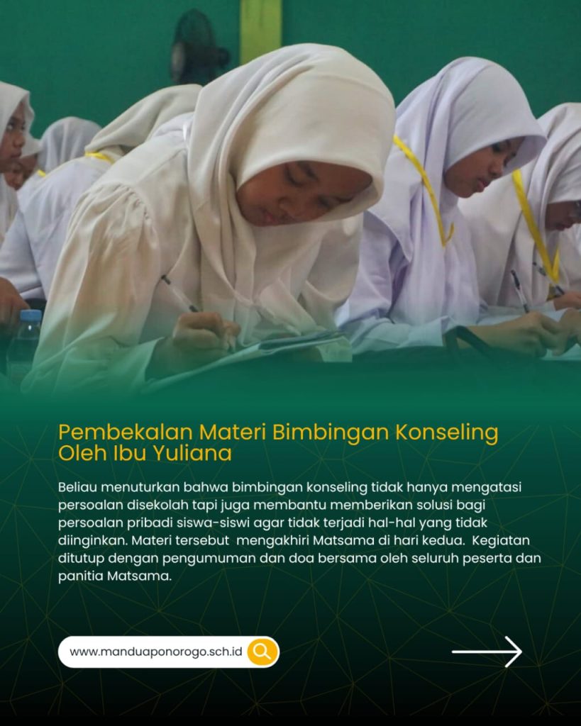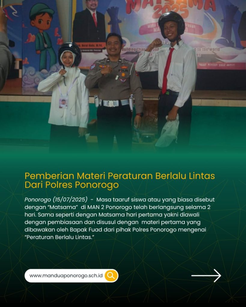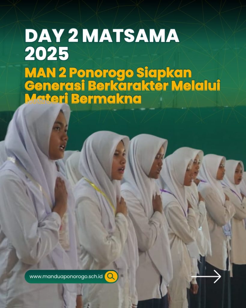 🚀✨ MATSAMA DAY 2! Siapkan Generasi Berkarakter & Berprestasi! 💪🏽🎓 Hari kedua Matsama di MAN 2 Ponorogo penuh makna! 💥 Mulai dari edukasi tertib lalu lintas, perlindungan anak, ikrar anti bullying, tata tertib madrasah, hingga bimbingan konseling — semua dirancang supaya siswa baru siap jadi pribadi hebat, disiplin, dan peduli! 🤝❤️ 🎁 Ada juga sesi seru hadiah helm, peragaan seragam, makan bareng, dan penutup doa penuh harap. Semoga semua materi jadi bekal berharga buat masa depan! 🌟 🔥 Yuk, buktikan kalau kalian siap jadi generasi madrasah yang berkarakter, berakhlak, dan berprestasi! #Matsama2025 #MAN2Ponorogo #TheWorldMadrasah