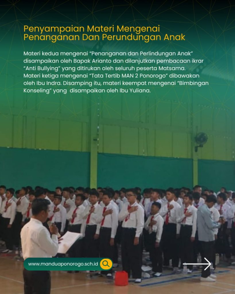 Setelah itu dilanjutkan pembacaan ikrar “Anti Bullying” yang ditirukan oleh seluruh peserta Matsama dengan tujuan agar MAN 2 Ponorogo terhindar dari aksi bullying dan menjadi pribadi yang lebih baik.