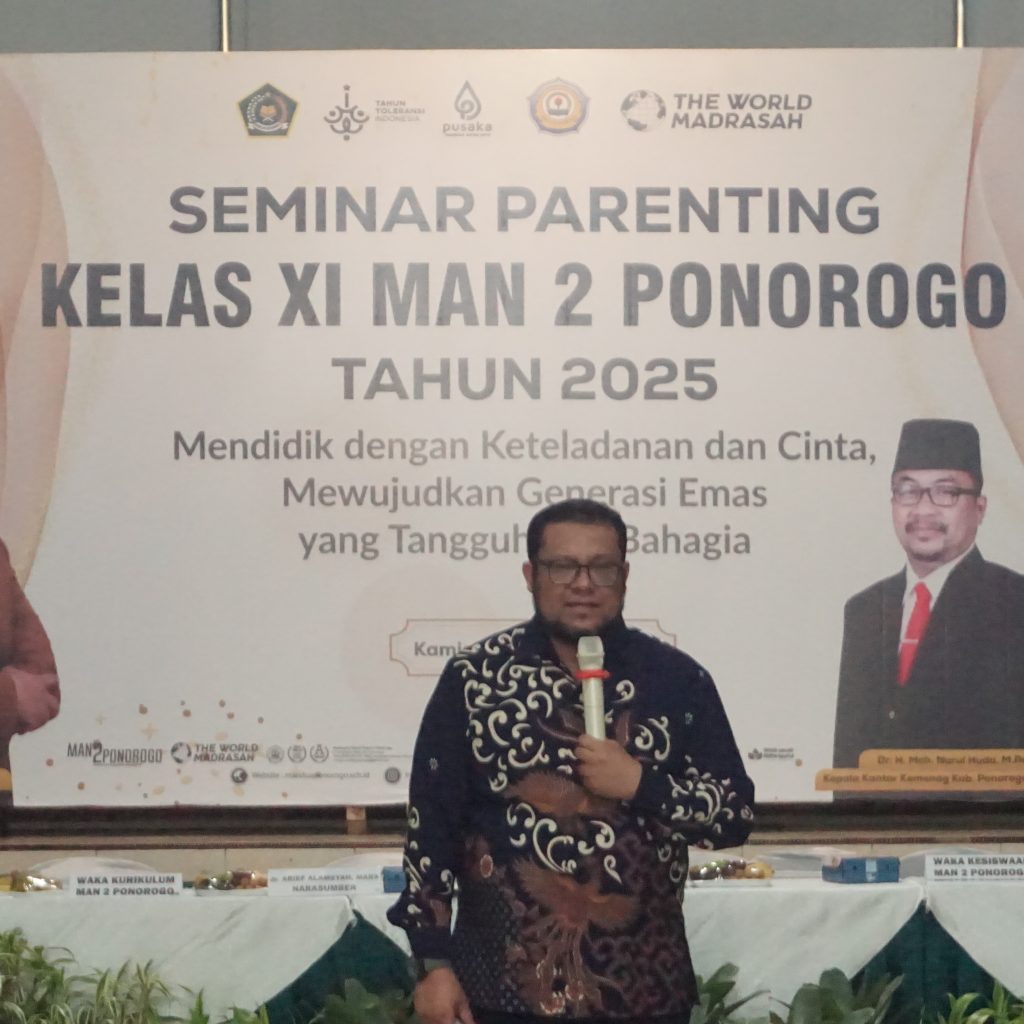 Ponorogo, 28 Agustus 2025 – MAN 2 Ponorogo menggelar acara seminar parenting bagi wali murid kelas XI dengan tema “Mendidik dengan Keteladanan dan Cinta, Wujudkan Generasi Emas yang Tangguh dan Bahagia”. Acara ini menghadirkan Dr. Ariel Alamsyah sebagai pemateri utama.