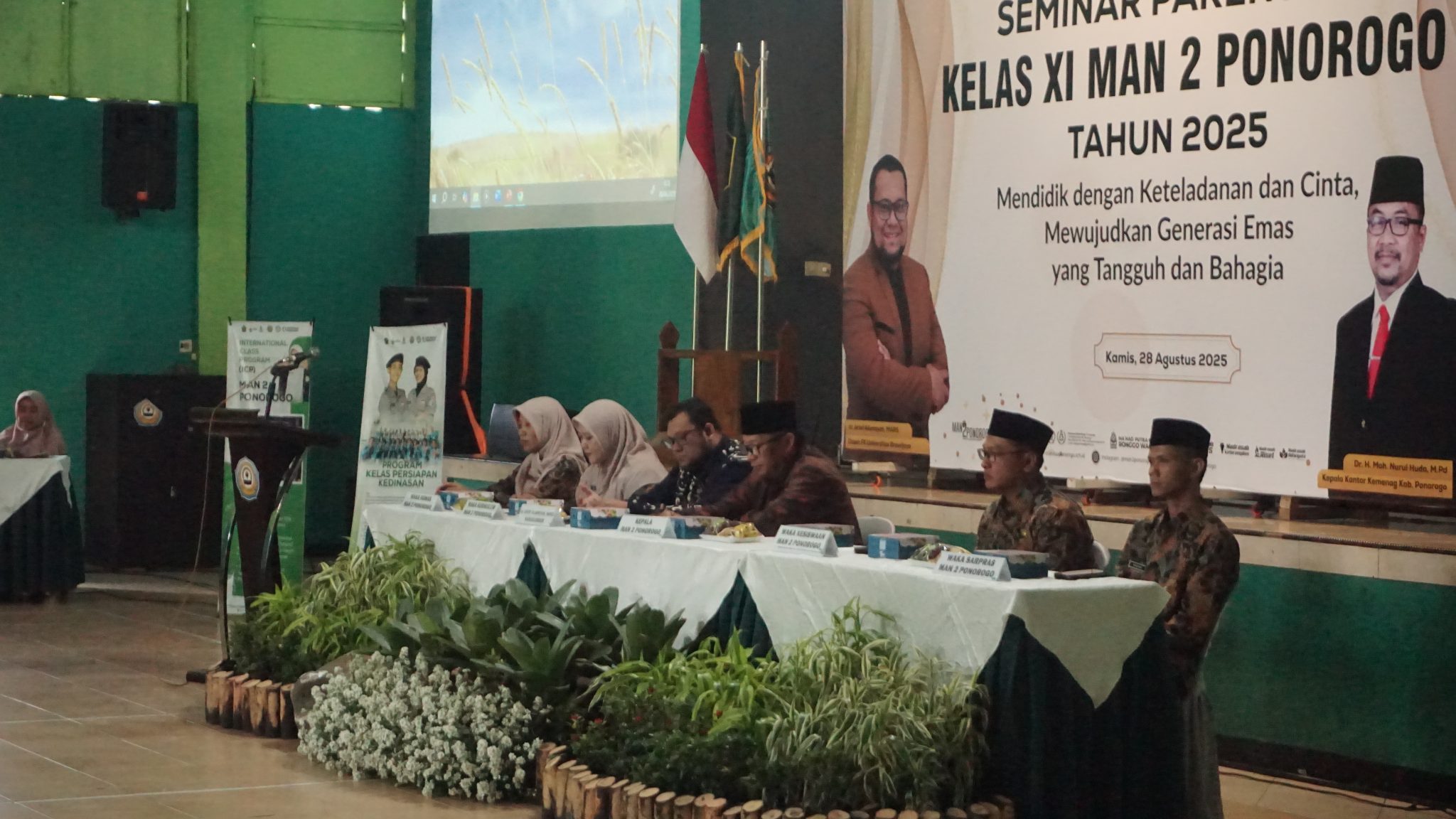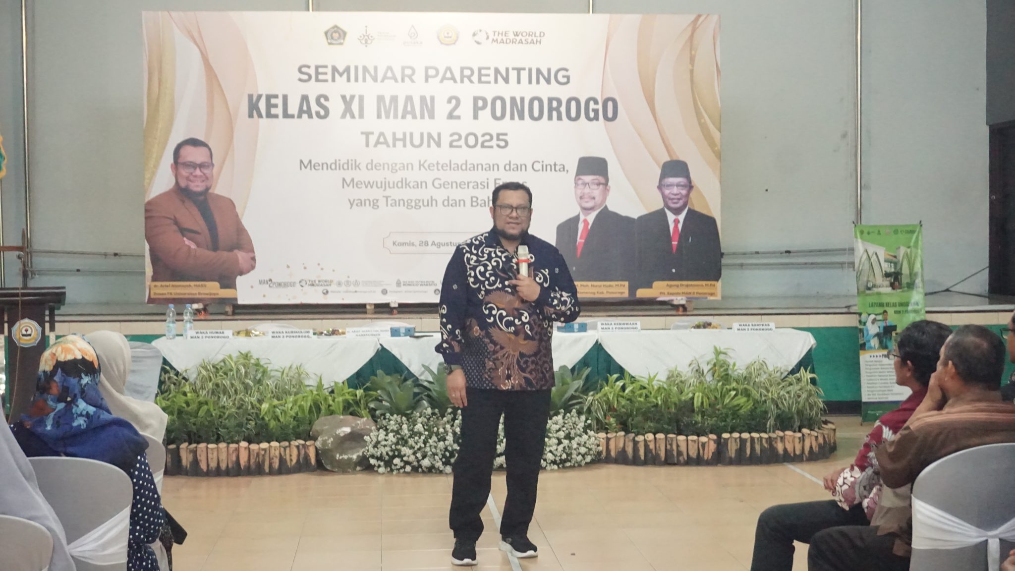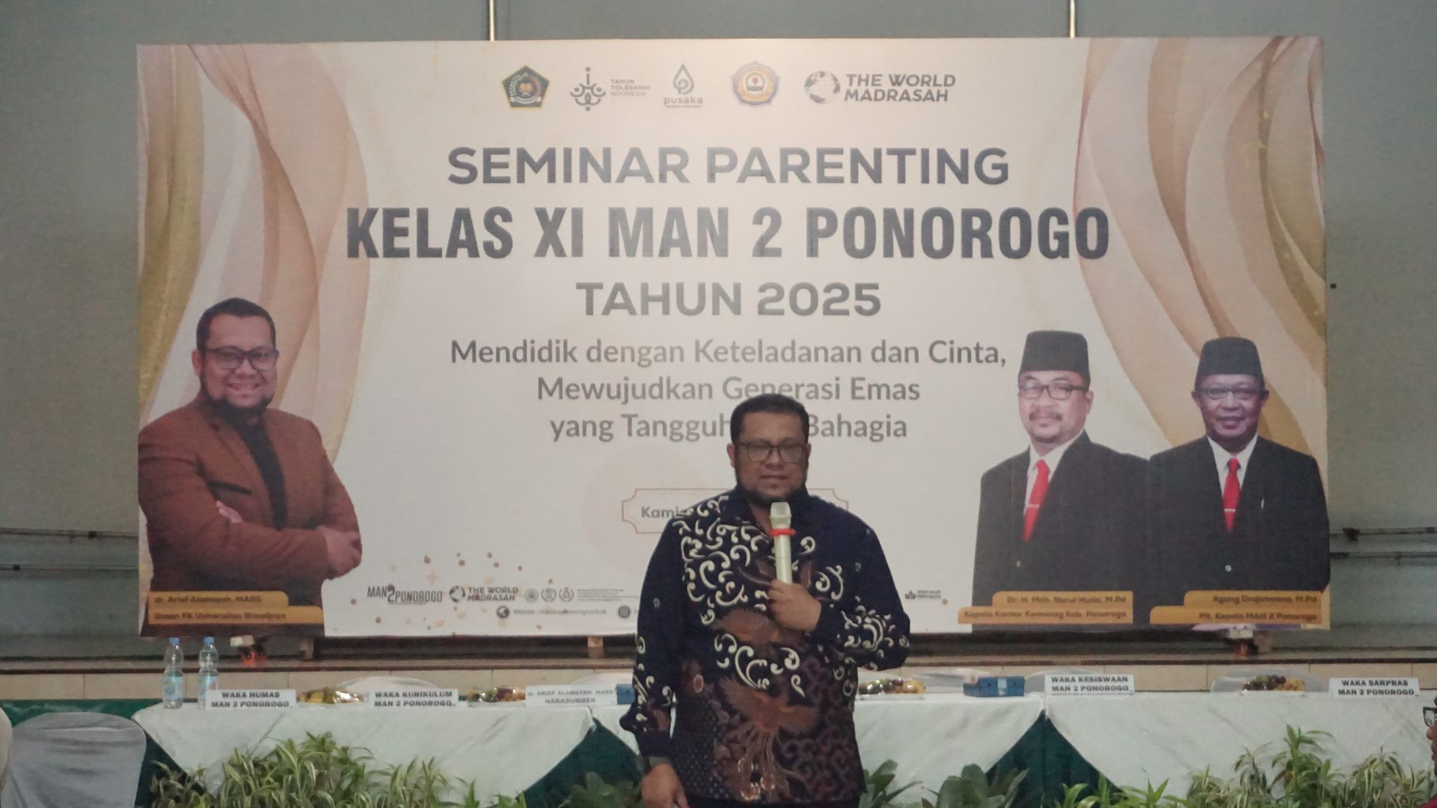 Ponorogo, 28 Agustus 2025 – MAN 2 Ponorogo menggelar acara seminar parenting bagi wali murid kelas XI dengan tema “Mendidik dengan Keteladanan dan Cinta, Wujudkan Generasi Emas yang Tangguh dan Bahagia”. Acara ini menghadirkan Dr. Ariel Alamsyah sebagai pemateri utama.