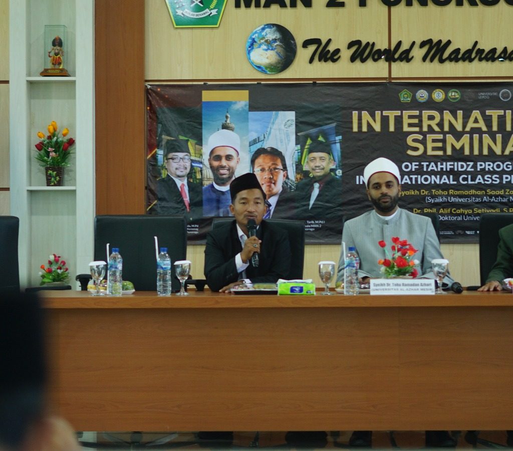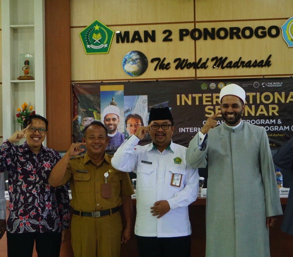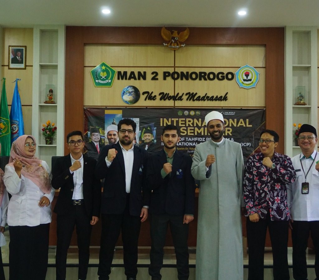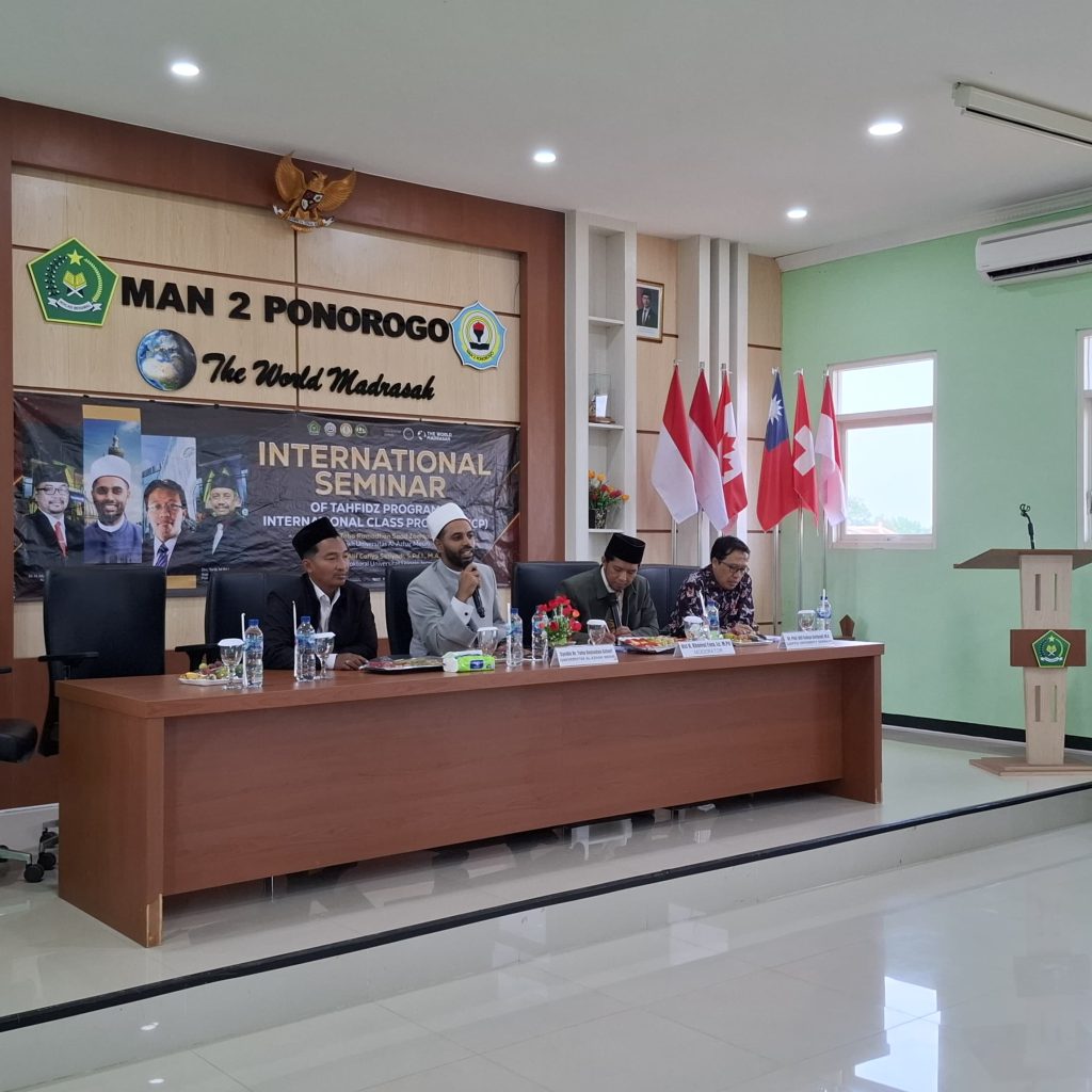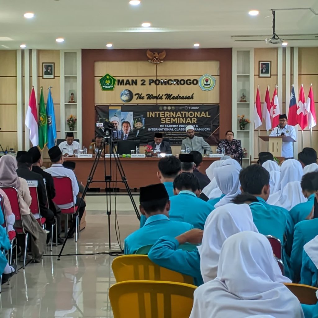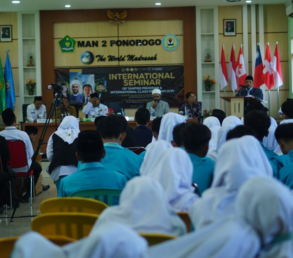 Ponorogo (11/11/2024) MAN 2 Ponoorgo semakin mendunia. Bertempat di aula MAN 2 Ponorogo diadakan seminar Internasional. Acara dimulai dengan pembacaan Asmaul Husna oleh beberapa siswa dan siswa dari program ICP dan program tahfidz. Dilanjutkan dengan menyanyikan lagu Kebangsaan Indonesia dan Mesir. Seminar ini diikuti oleh 145 peserta dan dihadiri oleh beberapa tamu penting seperti Kepala Kemenag Ponorogo, Kepala Dinas Pendidikan Ponorogo, Kepala Seksi Pendidikan Agama, Kelompok Kerja Pengawas, Kepala MAN dan MTSN Ponorogo dan perwakilan wali murid program tahfidz dan ICP. Tak tanggung tanggung Syeikh Dr. Toha Romadhon Azhari dari mesir dan Dr. Phil. Alif Cahya Setyadi M.A. lulusan dari Universitas Leipzig Jerman diundang untuk menjadi pembicara pada seminar kali ini.