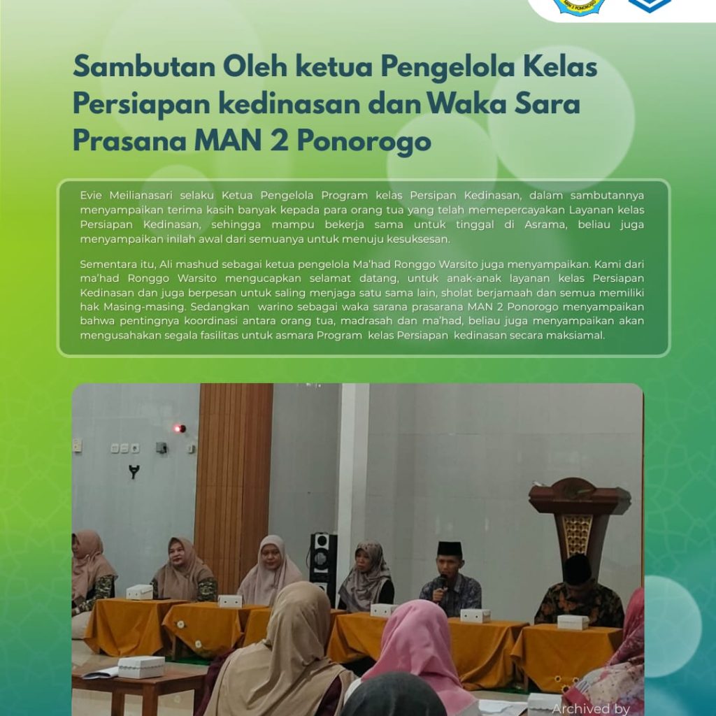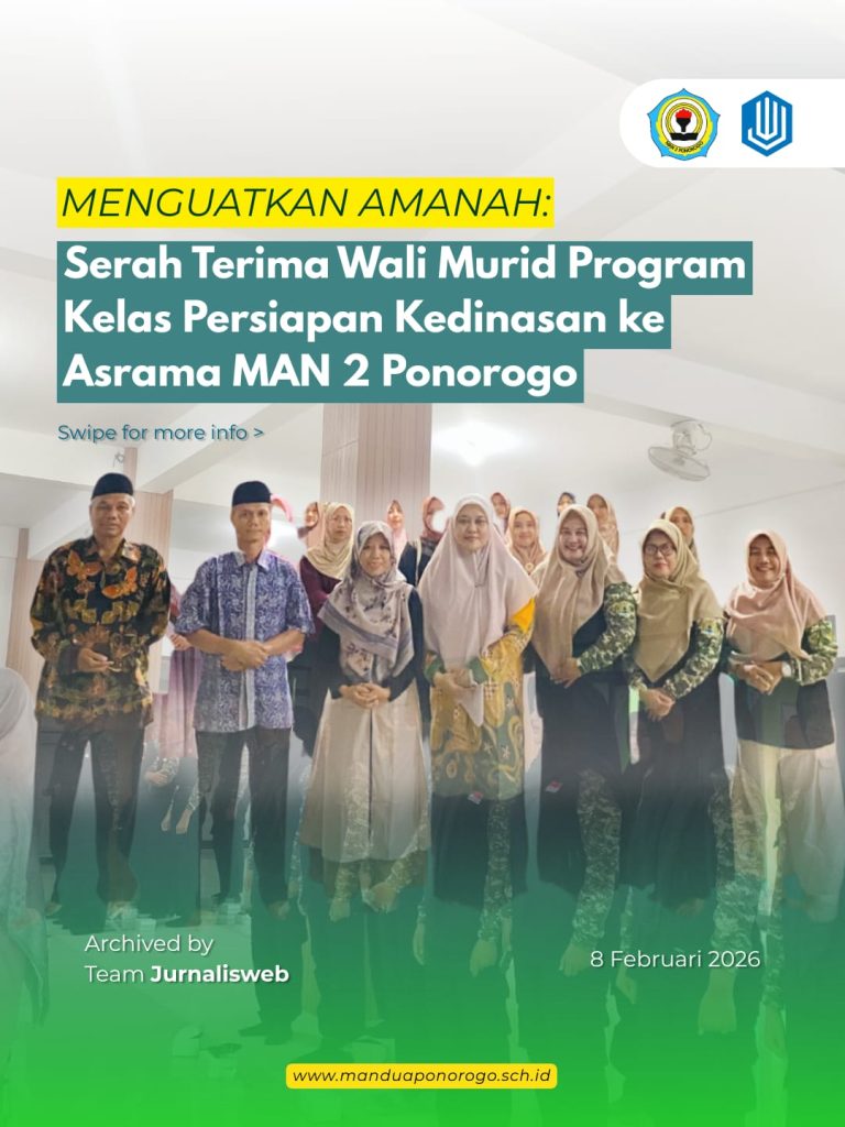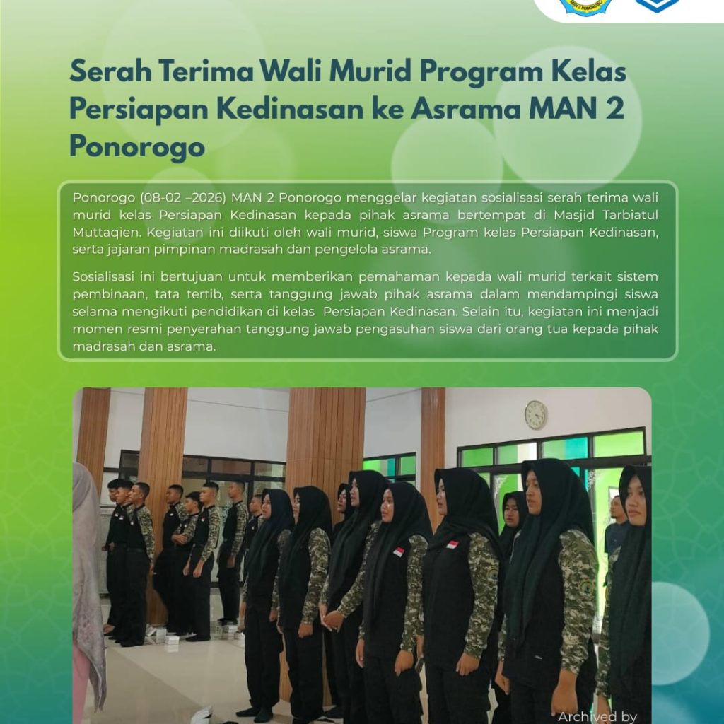 Ponorogo (08-02 –2026) MAN 2 Ponorogo menggelar kegiatan sosialisasi serah terima wali murid kelas kedinasan kepada pihak asrama bertempat di Masjid Tarbiatul Muttaqien. Kegiatan ini diikuti oleh wali murid, siswa Program kelas Persiapan kedinasan, serta jajaran pimpinan madrasah dan pengelola asrama.