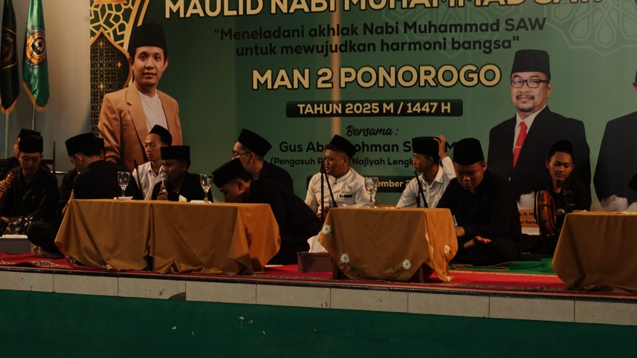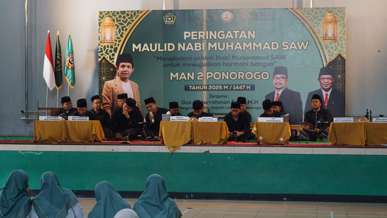 Ponorogo- (11/09/2025) – MAN 2 Ponorogo menyelenggarakan peringatan maulid Nabi Muhammad SAW dengan nuansa kebersamaan. Peringatan maulid Nabi Muhammad SAW dilaksanakan dengan meriah di GOR MAN 2 Ponorogo. Acara ini diawali dengan penampilan Al Banjari dari Majelis Ta’lim Ulul Albab. dilanjutkan menyanyikan lagu Indonesia Raya yang dibawakan oleh Ayudina, dan Lagu yalal wathon. Acara ini di hadiri oleh Dr. Moh. Nurul Huda kepala kantor kemenag Kabupaten Ponorogo.