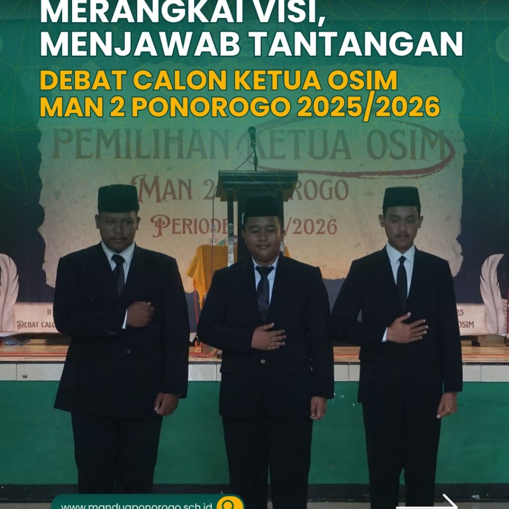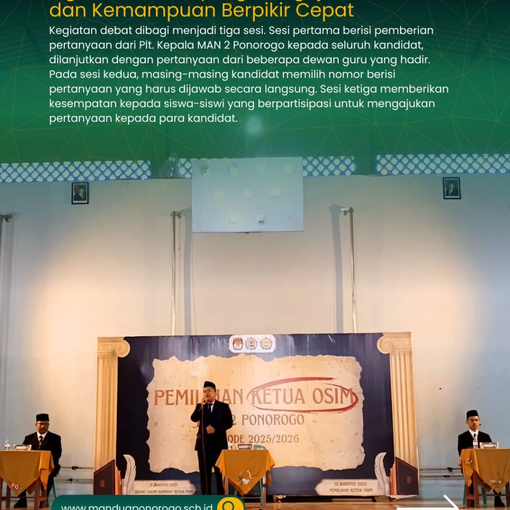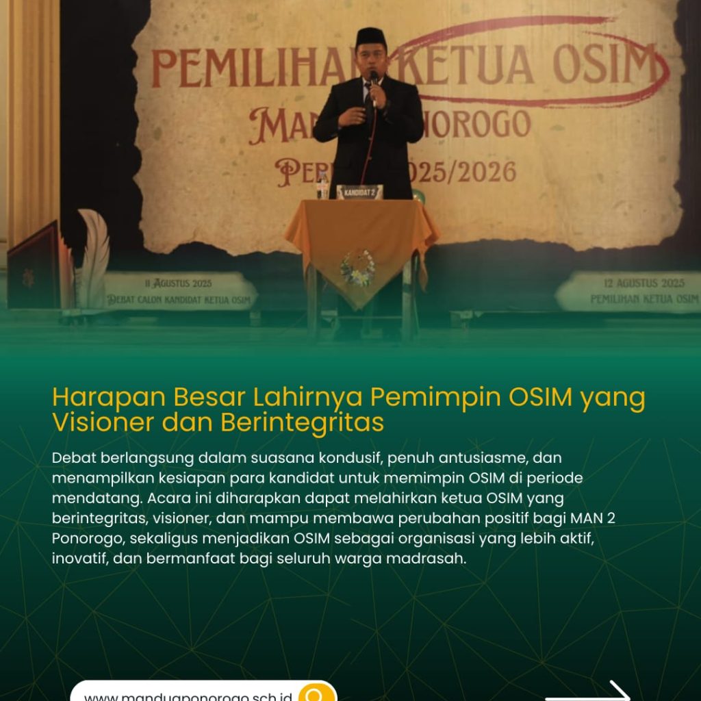 Kegiatan debat berlangsung dalam suasana kondusif, penuh antusiasme, dan menunjukkan kesiapan para kandidat untuk menjadi pemimpin OSIM periode berikutnya. Acara ini diharapkan dapat melahirkan ketua OSIM yang berintegritas, visioner, dan mampu membawa perubahan positif bagi MAN 2 Ponorogo, sekaligus menjadikan OSIM MAN 2 Ponorogo sebagai organisasi yang lebih aktif, inovatif, dan bermanfaat bagi seluruh warga madrasah.