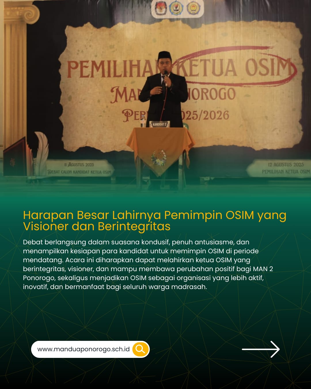 Kegiatan debat berlangsung dalam suasana kondusif, penuh antusiasme, dan menunjukkan kesiapan para kandidat untuk menjadi pemimpin OSIM periode berikutnya. Acara ini diharapkan dapat melahirkan ketua OSIM yang berintegritas, visioner, dan mampu membawa perubahan positif bagi MAN 2 Ponorogo, sekaligus menjadikan OSIM MAN 2 Ponorogo sebagai organisasi yang lebih aktif, inovatif, dan bermanfaat bagi seluruh warga madrasah.