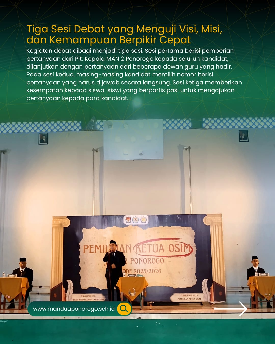 Ponorogo (11/08/25) – MAN 2 Ponorogo menyelenggarakan kegiatan Debat dan Orasi Kandidat Calon Ketua OSIM sebagai bagian dari rangkaian pemilihan ketua OSIM periode 2025/2026. Acara yang berlangsung di GOR MAN 2 Ponorogo ini diawali dengan pembukaan oleh MC, pembacaan ayat suci Al-Qur’an, menyanyikan lagu Indonesia Raya, dan dilanjutkan dengan doa.