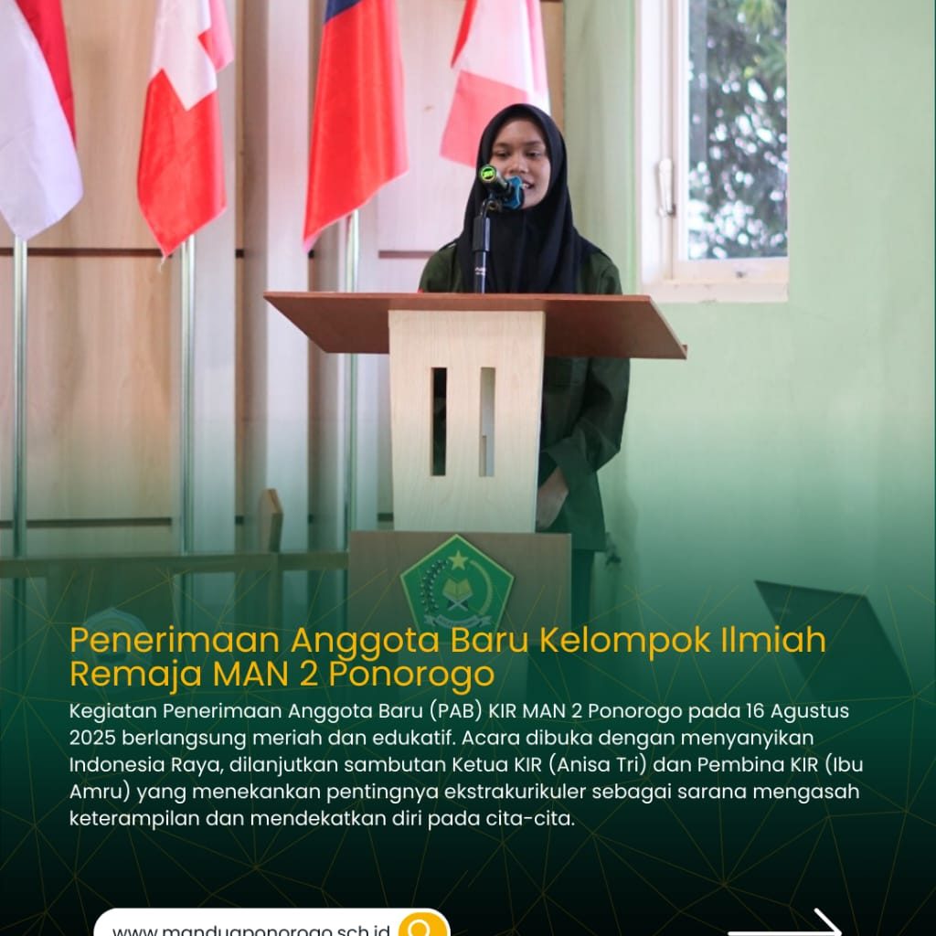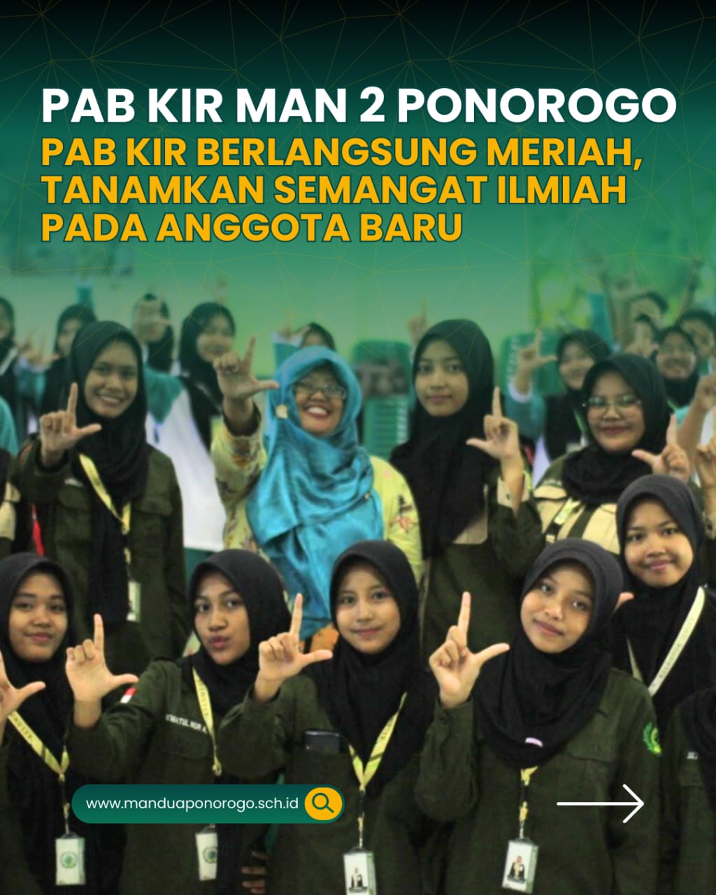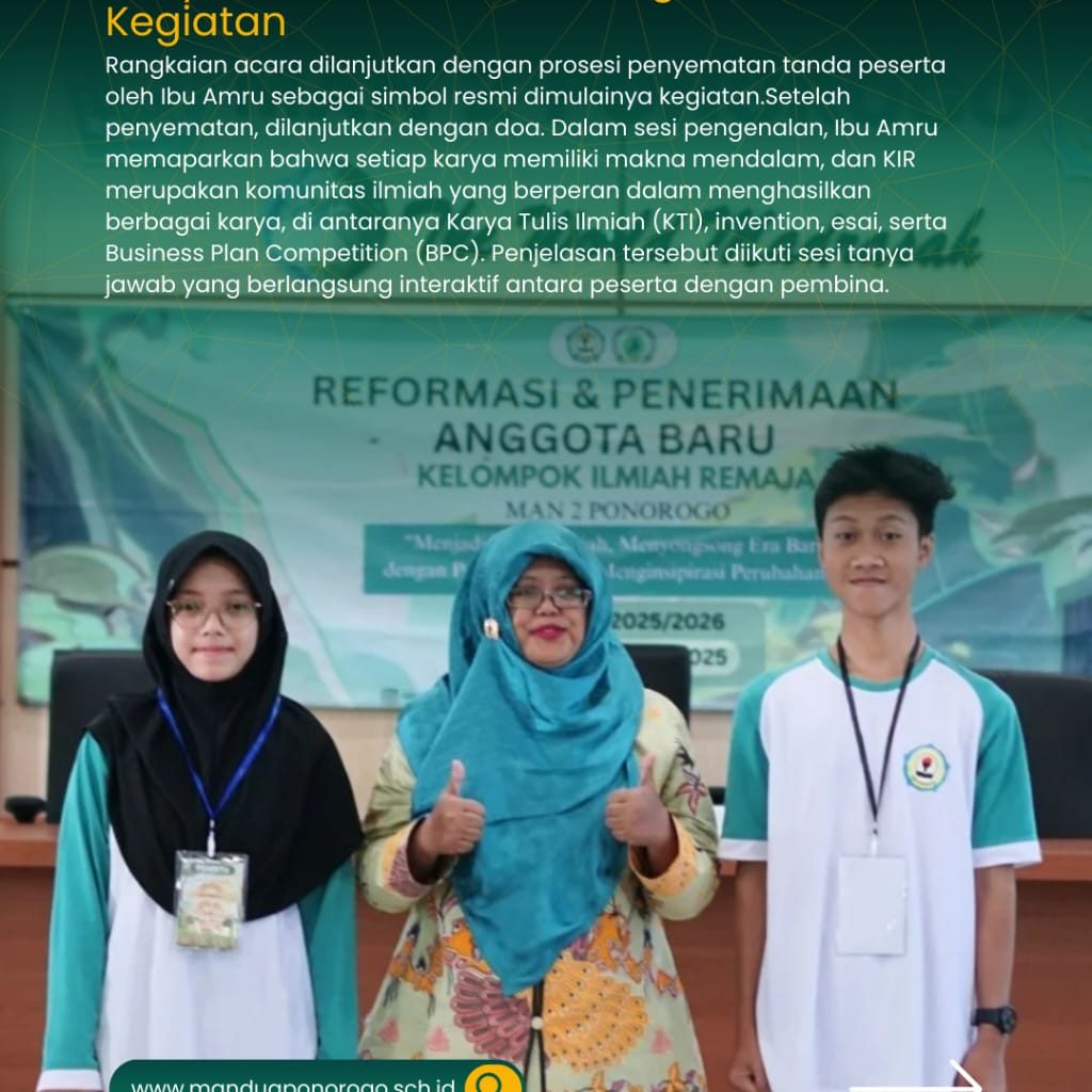 Ponorogo (16/08/25) — Kegiatan Penerimaan Anggota Baru (PAB) Kelompok Ilmiah Remaja (KIR) MAN 2 Ponorogo berlangsung meriah dan penuh semangat, dengan rangkaian acara yang bermakna dan mengedukasi.