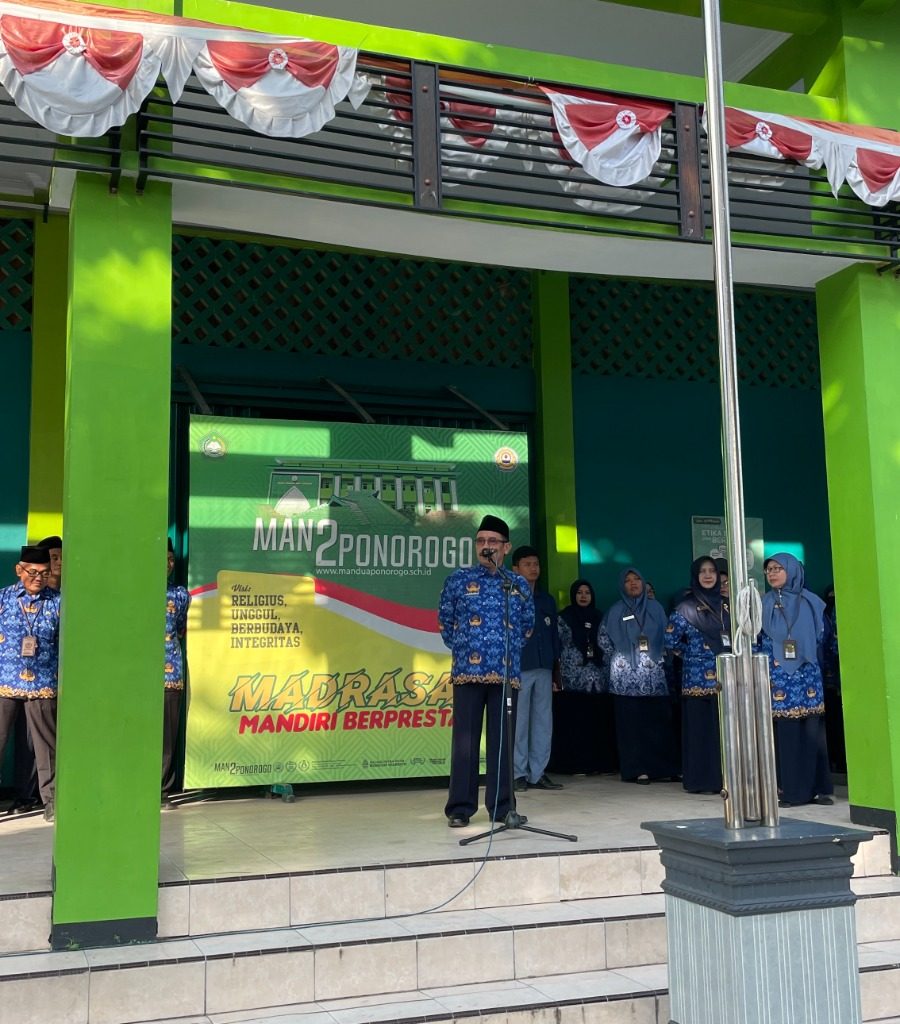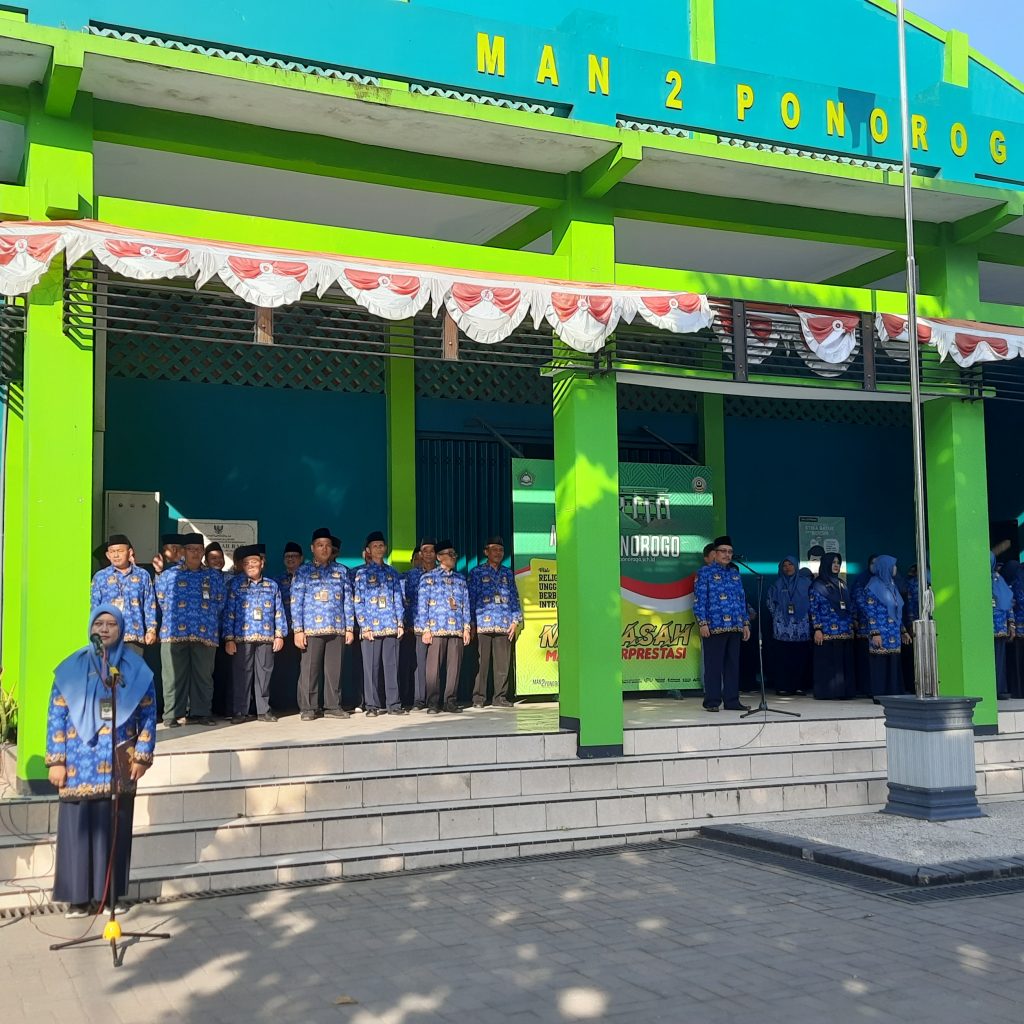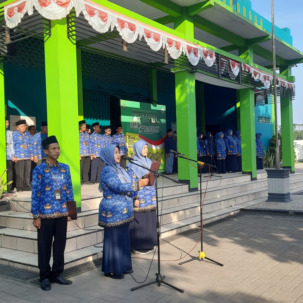 Ponorogo,1/6/2023. Peringatan hari lahir Pancasila di MAN 2 Ponorogo berlangsung khidmat. Agak berbeda dengan kegiatan upacara biasanya, bertindak sebagai petugas upacara adalah bapak-ibu guru dan siswa-siswi yang tergabung dalam ekstrakurikuler OSIM, PKS, Pramuka dan didukung oleh PMR. Bertempat di depan GOR MAN 2 Ponorogo,upacara diikuti oleh GTK dan seluruh siswa kelas X dan XI dengan pembina kepala madrasah, bapak Drs. Tarib,M.Pd.I