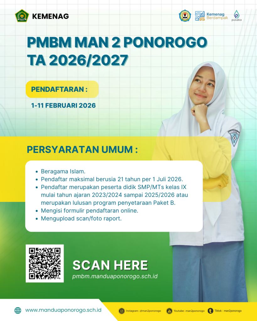 2-11 Februari 2026Pendaftaran Online atau Offline (mandiri / hadir ke MAN 2 Ponorogo)