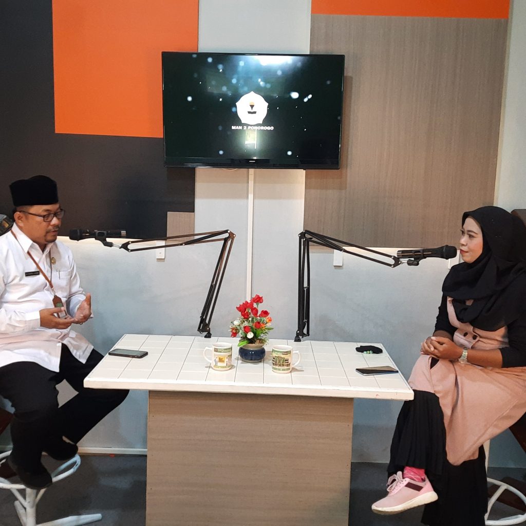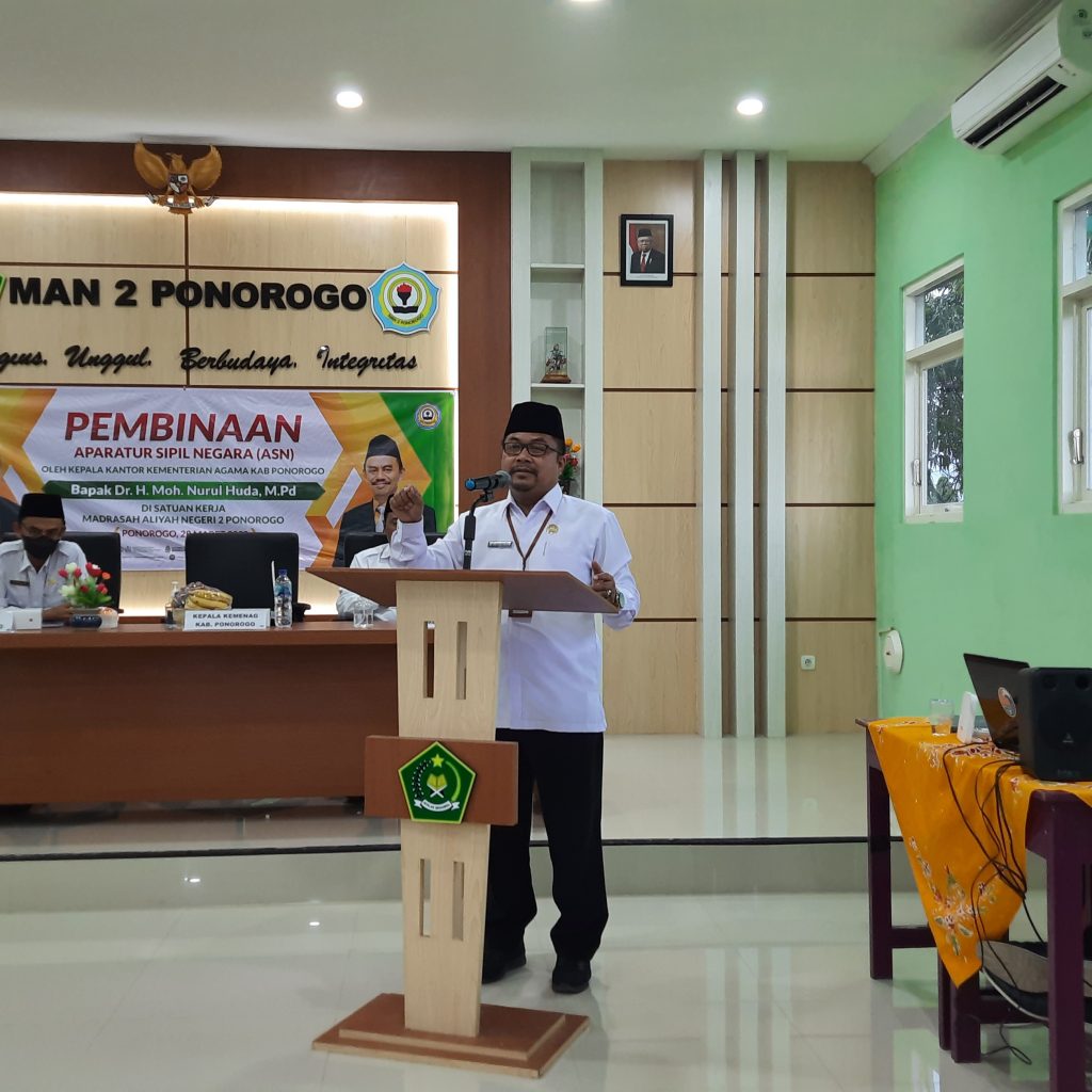 Senin, 28/03/2021. Terdapat dua agenda penting yang diselenggarakan oleh MAN 2 Ponorogo dalam rangka mendukung Zona Integritas di hari Senin, 28 Maret 2022 ini, yaitu Podcast dan pembinaan ASN (Aparatur Sipil Negara) di Satuan Kerja MAN 2 Ponorogo. Keduanya disampaikan oleh Kepala Kantor Kementerian Agama Kabupaten Ponorogo, Dr. H. Moh. Nurul Huda, M.Pd. Dalam sesi Podcast, beliau menyampaikan tentang pengalaman-pengalaman berharga serta program moderasi beragama untuk memberikan motivasi keberagamaan di tengah keragaman.