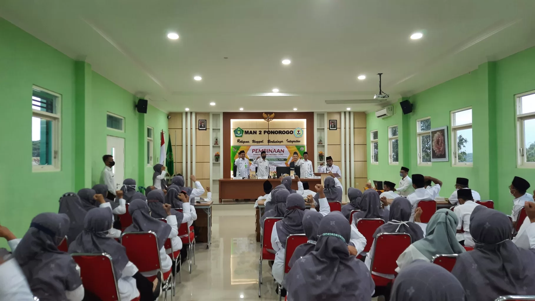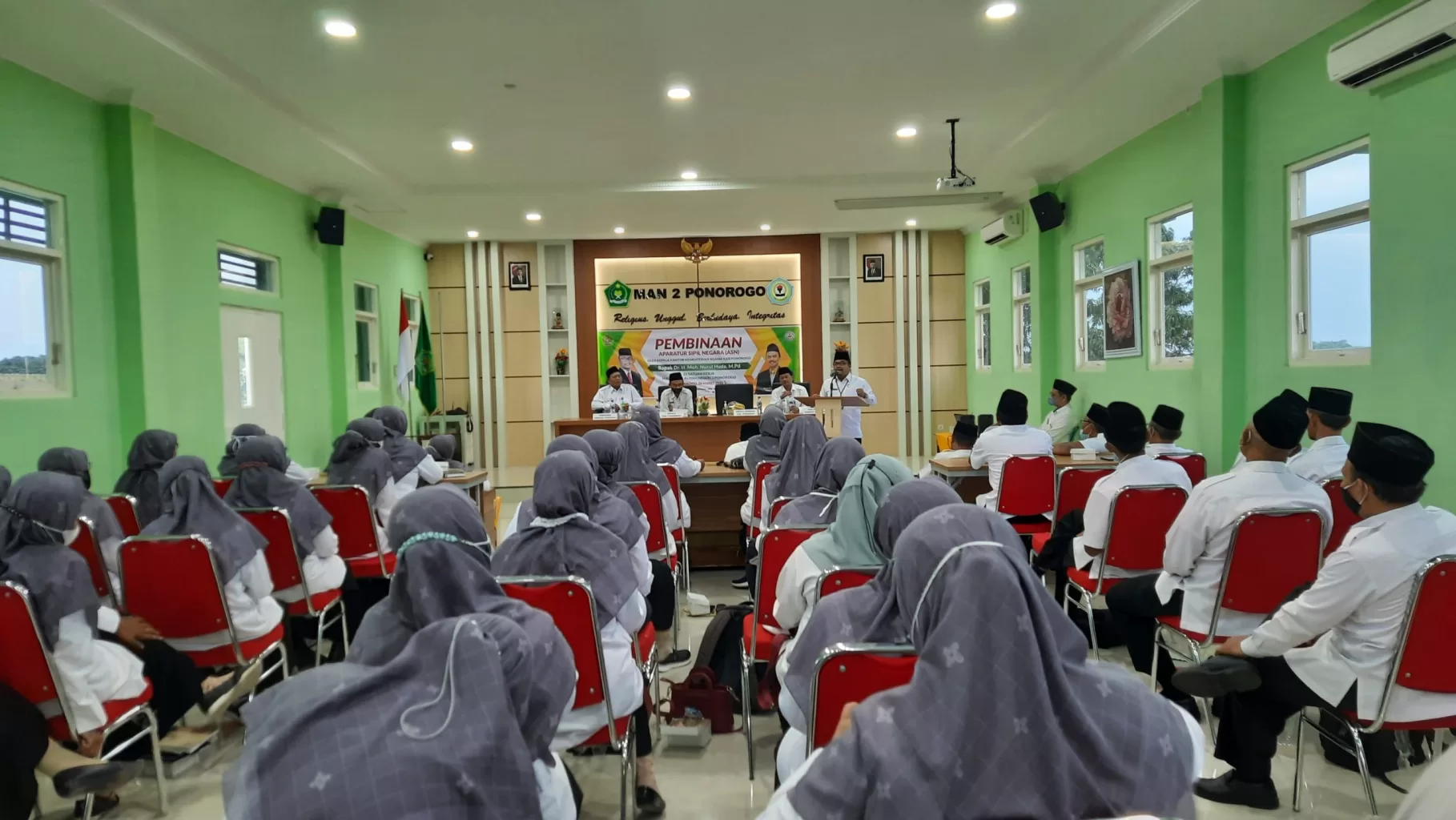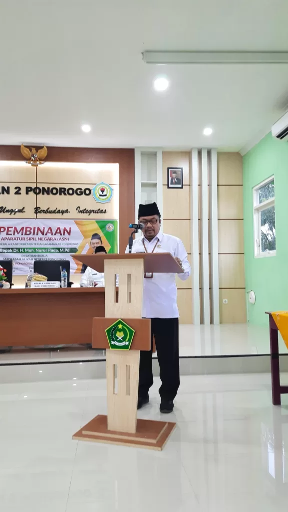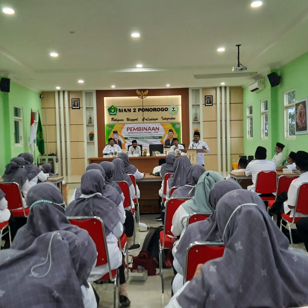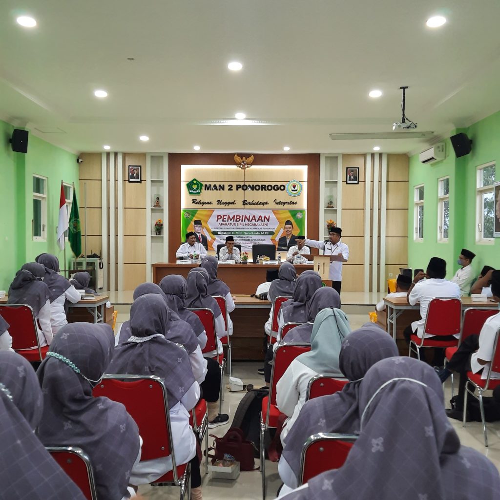 Acara berlanjut dengan Pembinaan ASN yang bertempat di aula MAN 2 Ponorogo. Para guru dan tenaga kependidikan yang mengikuti pembinaan sangat antusias dan semangat. Dalam satu kesempatan, bapak Dr. H. Moh. Nurul Huda, M.Pd. menyampaikan bahwa madrasah merupakan lembaga yang mampu menjawab tantangan situasi dan kondisi sekarang ini.