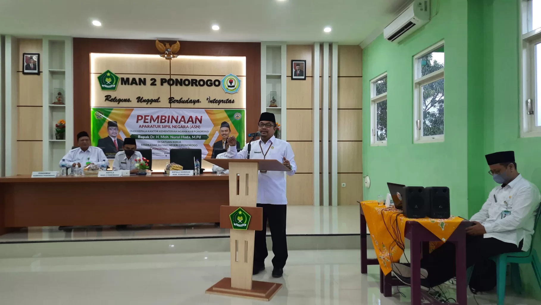 Senin, 28/03/2021. Terdapat dua agenda penting yang diselenggarakan oleh MAN 2 Ponorogo dalam rangka mendukung Zona Integritas di hari Senin, 28 Maret 2022 ini, yaitu Podcast dan pembinaan ASN (Aparatur Sipil Negara) di Satuan Kerja MAN 2 Ponorogo. Keduanya disampaikan oleh Kepala Kantor Kementerian Agama Kabupaten Ponorogo, Dr. H. Moh. Nurul Huda, M.Pd. Dalam sesi Podcast, beliau menyampaikan tentang pengalaman-pengalaman berharga serta program moderasi beragama untuk memberikan motivasi keberagamaan di tengah keragaman.