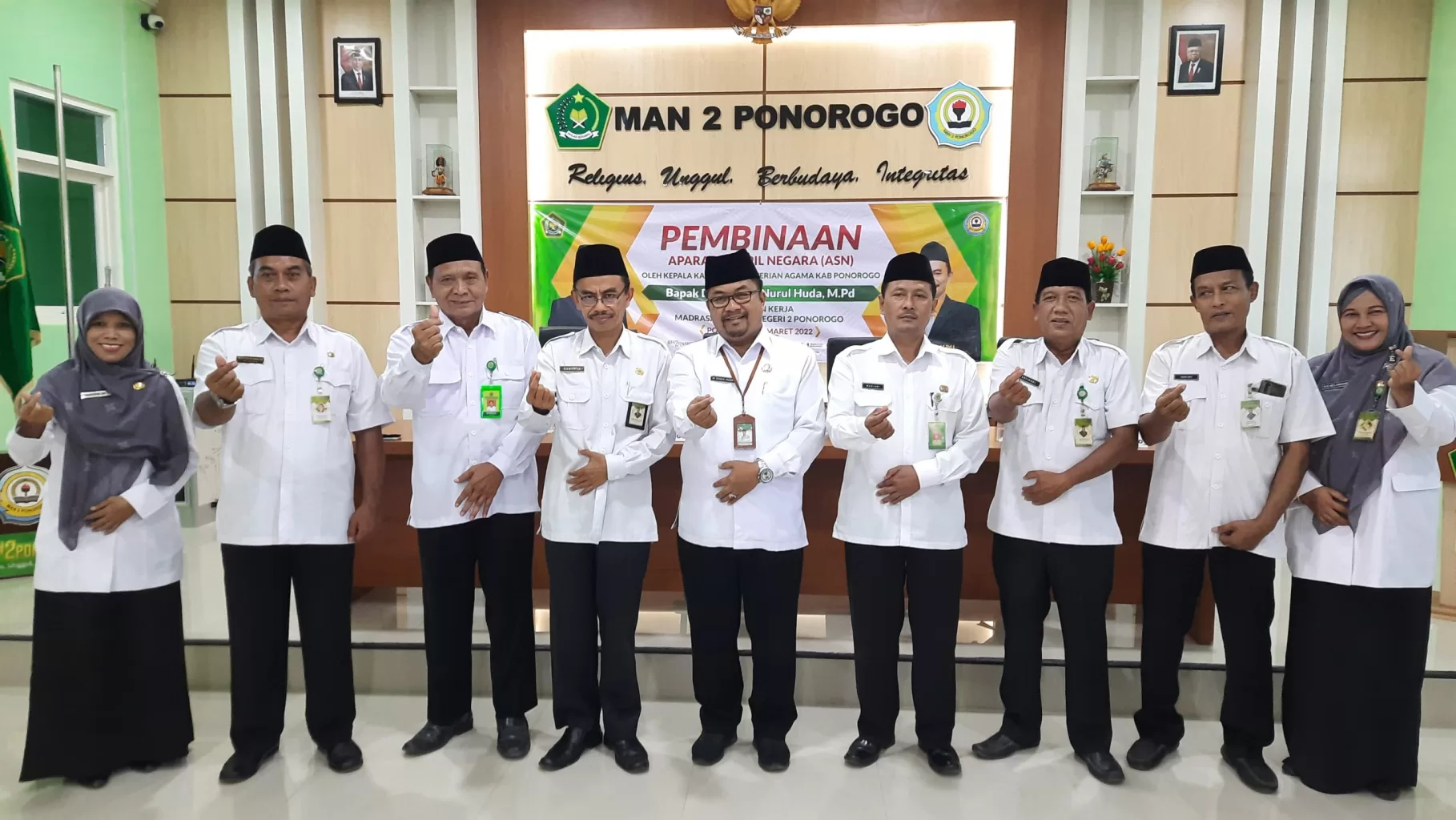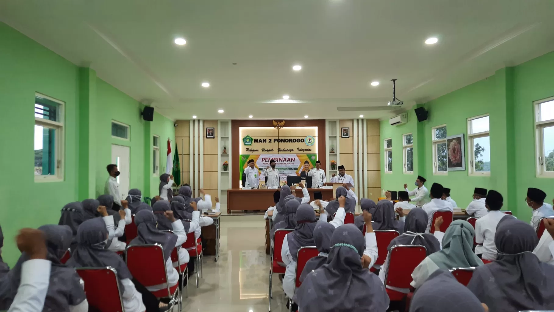 “Kami sangat berharap bagaimana para guru dan tenaga kependidikan dapat memahami apa yang saya sampaikan dan diadopsi. Setelah diadopsi kemudian diimplementasi. Setelah di implementasi kemudian dievaluasi. Ketika mampu mengadopsi, mengimplementasikan, dan mengevaluasi insyaallah Madrasah Aliyah Negeri 2 Ponorogo ini akan menjadi hebat, bermartabat, mandiri dan terus berprestasi”. Demikian harapan Bapak Dr.H.Moh.Nurul Huda, M.Pd. setelah diadakannya kegiatan Pembinaan ASN kali ini.