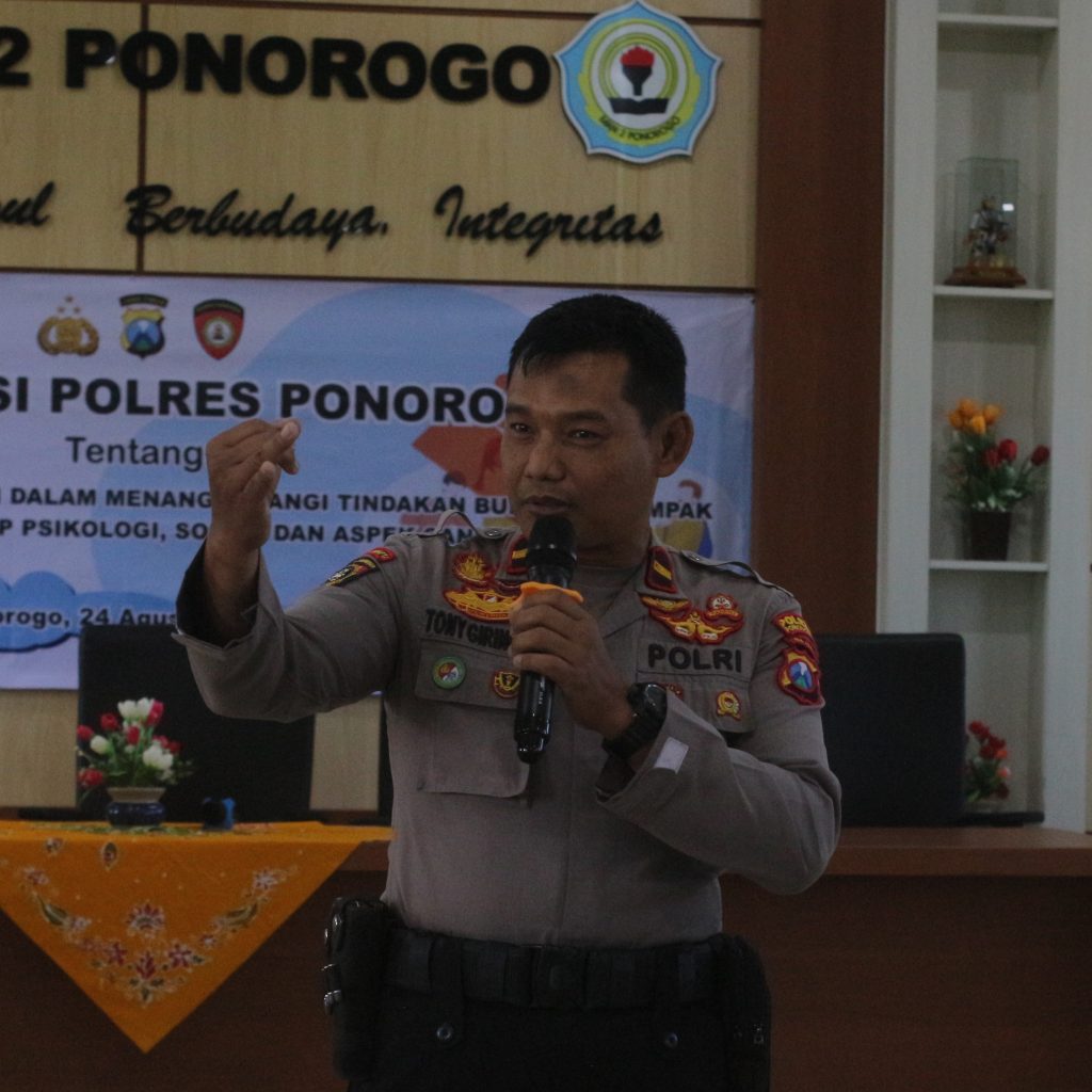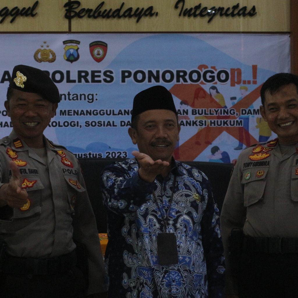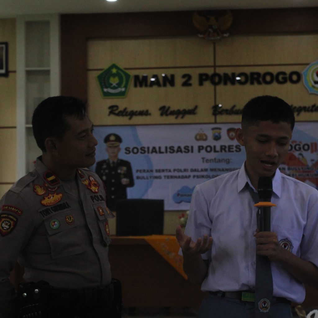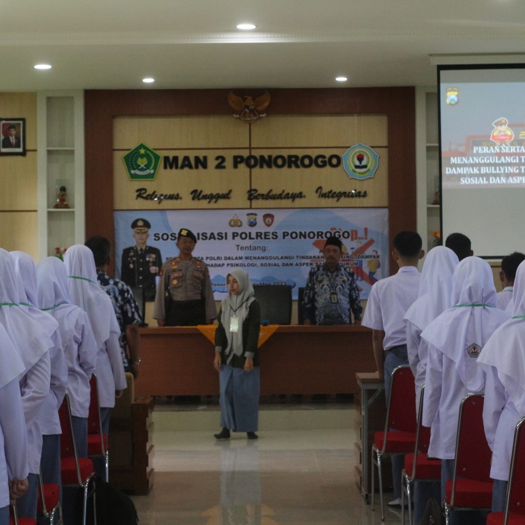 Ponorogo, 24 Agustus 2023. Maraknya berita-berita perundungan di ranah pendidikan semakin meresahkan masyarakat. Untuk itu, Polres Ponorogo mengadakan sosialisasi penanggulangan bullying di lingkungan MAN 2 Ponorogo. Sasarannya yaitu siswa-siswi MAN 2 Ponorogo. Tujuan kegiatan ini untuk memberikan edukasi cara penanggulangan bullying agar tidak menjadi dampak panjang bagi korban.