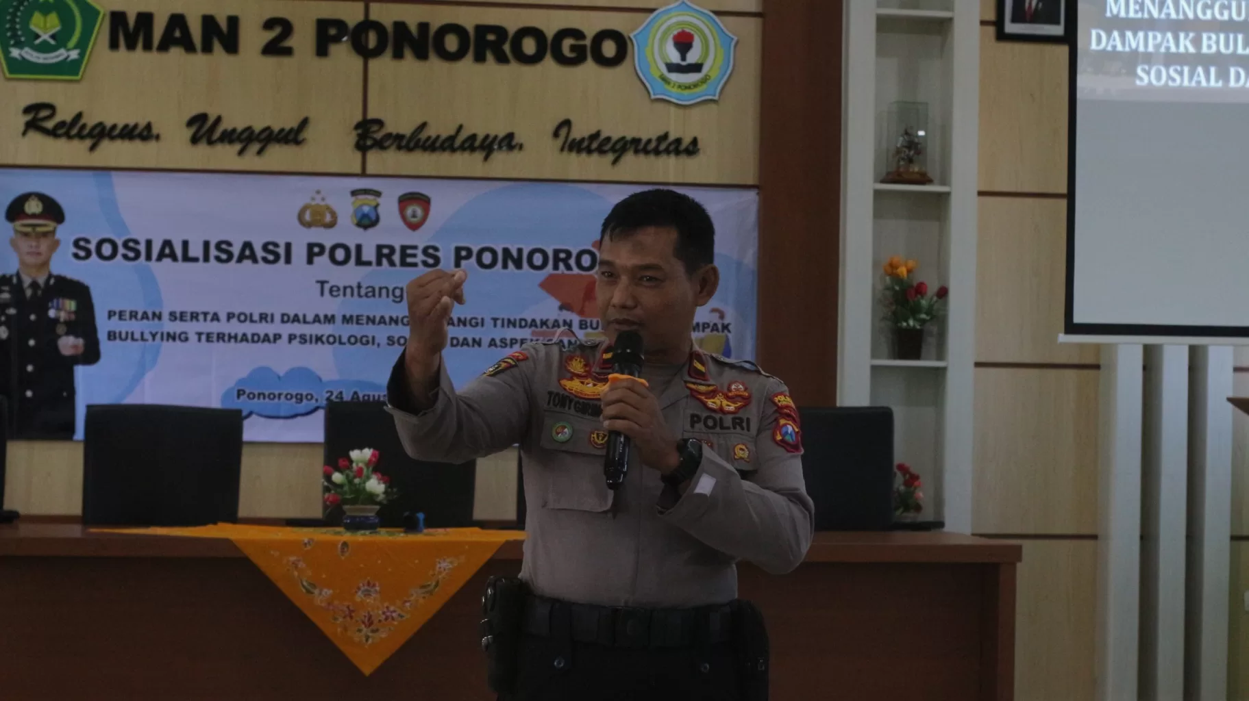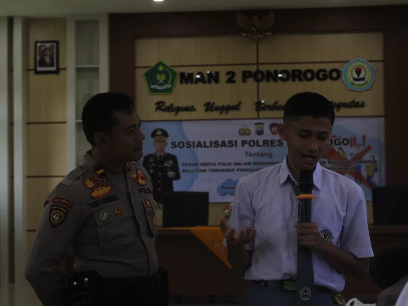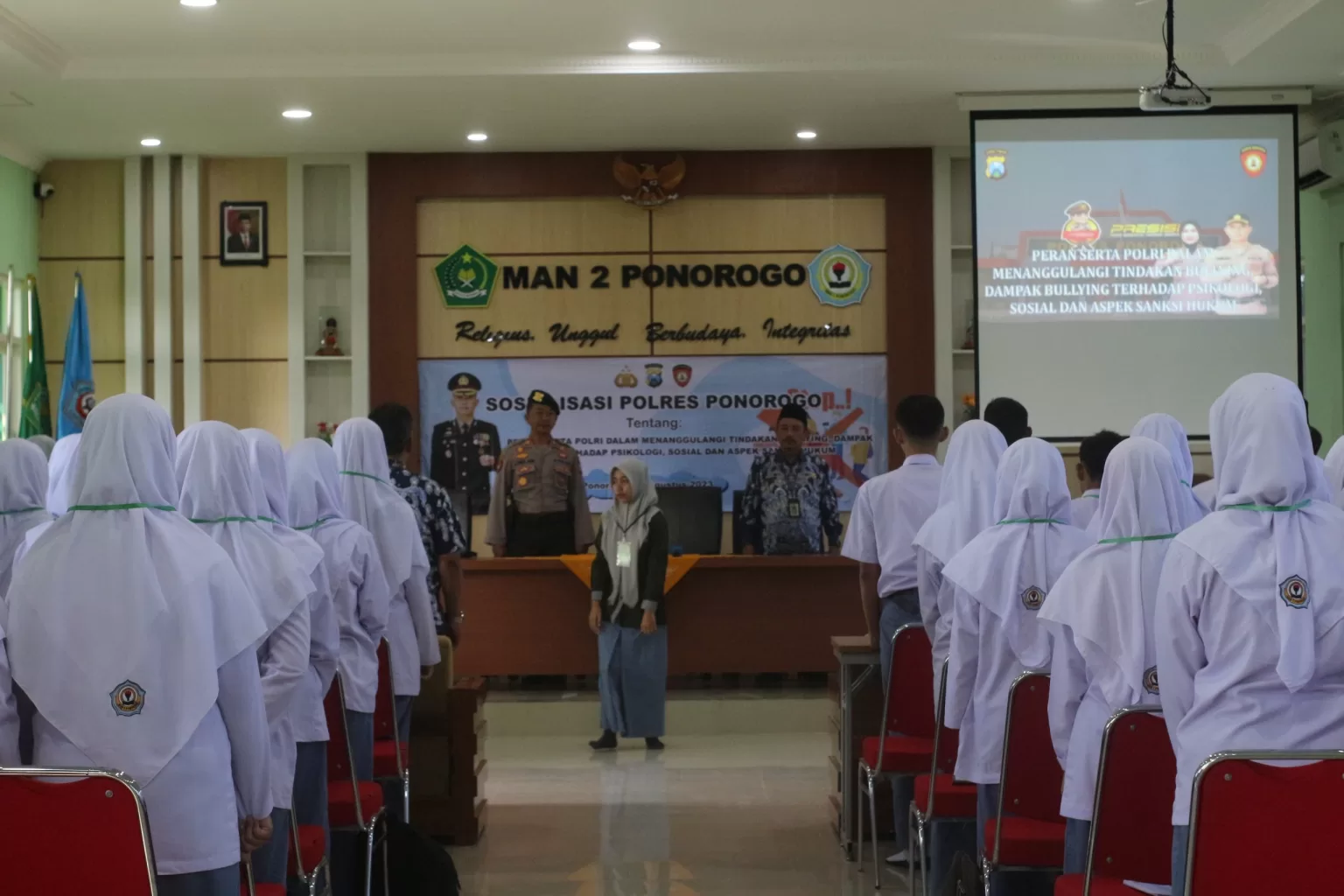 Ponorogo, 24 Agustus 2023. Maraknya berita-berita perundungan di ranah pendidikan semakin meresahkan masyarakat. Untuk itu, Polres Ponorogo mengadakan sosialisasi penanggulangan bullying di lingkungan MAN 2 Ponorogo. Sasarannya yaitu siswa-siswi MAN 2 Ponorogo. Tujuan kegiatan ini untuk memberikan edukasi cara penanggulangan bullying agar tidak menjadi dampak panjang bagi korban.